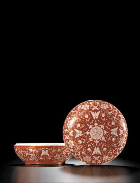 雍正矾红彩留白「彩蝶戏花」图圆盖盒