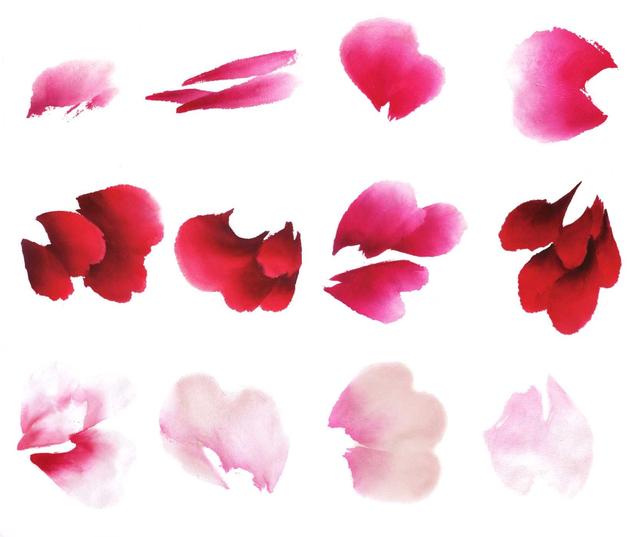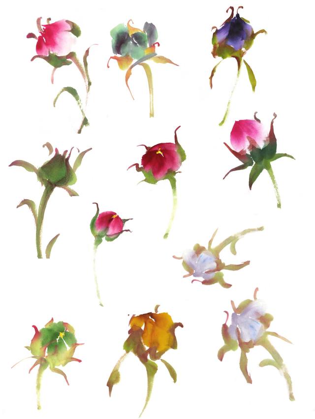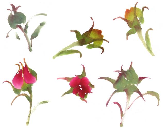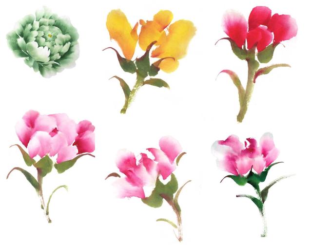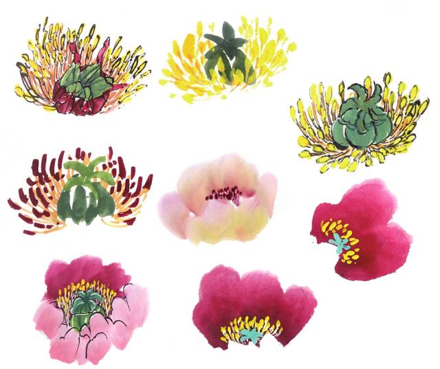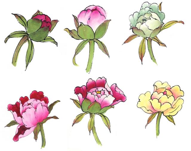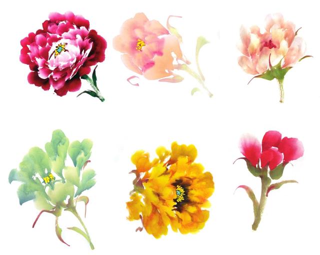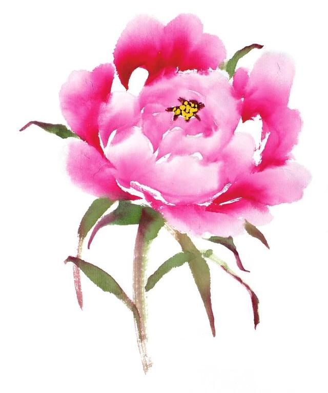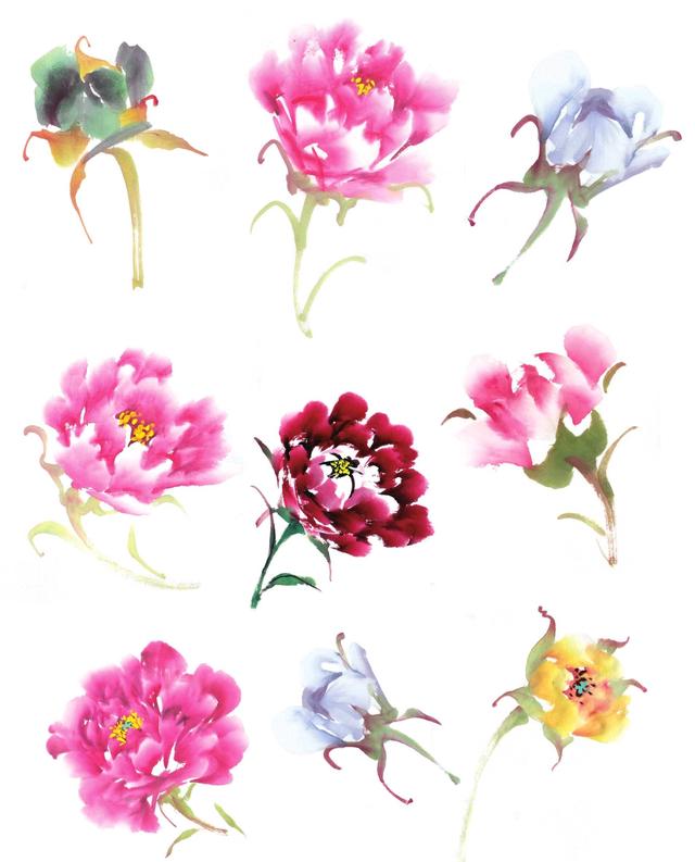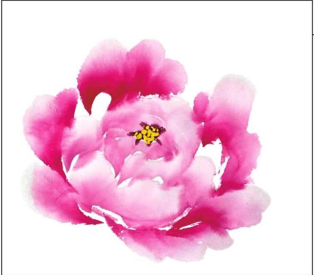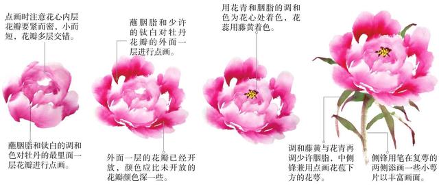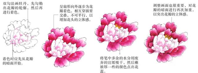 没骨法绘制牡丹时直接用颜色点画而成,刻画时藏锋侧入点画花瓣,一笔一瓣,形态力求在方圆之间。绘制暗部时笔尖蘸墨色以突出花瓣的体积感。
