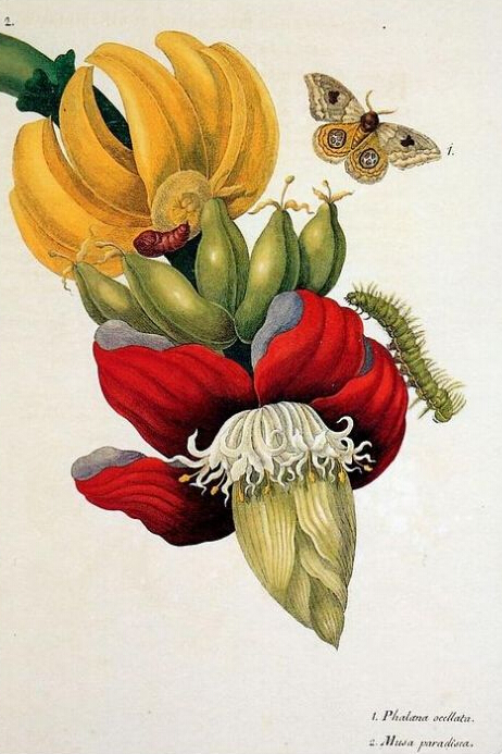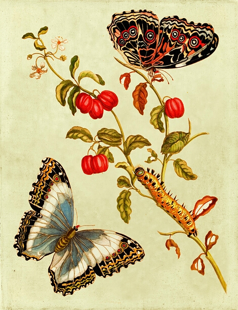 而17世纪存在于伦敦自然史博物馆的那些珍贵且栩栩如生、美仑美奂的生物图画,在三百年前没有简便的相机,很少有人知道他们是如何完成的?德国女画家玛丽亚·西比拉·梅里安,她是自然主义学者、昆虫专家和画家,被后世的昆虫学家及自然史绘画学生推崇至极。玛丽亚·西比拉·梅里安的作品在描绘昆虫时,将昆虫的成长形态与昆虫的植物宿主巧妙地绘在一起,完美结合了自然的艺术美态与自然科学的严谨。。。。