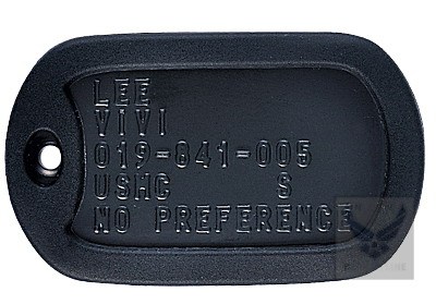 越战时期身份牌的陆军士兵号开始有前缀了,例如大家看到的RA就是Regular Army(常规陆军,指志愿入伍者),US(强行征召入伍者),NG(National Guard 国民卫队),ER(Enlisted Reserve 应征后备役者),O(Officer,军官)。社会保险号码为9为数字,1967年,美国陆军引入社会保险号码后,一直到1969年这期间,身份牌上两个号码是并存的,到了1969年后,身份牌上的识别号码就只有社会保险号码了。宗教信仰那一栏也有所改变,如果一个士兵是没有宗教信仰的话,该栏不再是空白,而是打上"NO PREFERENCE"。而现役身份牌中,除了陆军以外的军种在身份牌上都会打上相应的军种名称,例如USN,USMC,USCGR,USAF等。