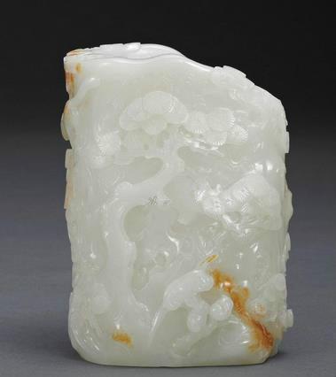 此件精美白玉笔筒乃和田上等羊脂白玉琢制。筒身取古松段作主体,加以古松、灵芝、松鼠作纹饰,笔筒外壁浮雕松干曲折盘绕,松树下盛开灵芝数朵,以及松鼠嬉戏其间,使笔筒洋溢出一股如书画般清新、优雅赏心悦目的画面,加上高超的雕工,实令人爱不释手。松——遇霜雪而不凋,遇干旱仍能生机盎然,犹如文士坚毅不屈的风骨,自古以来已被文人、雅士所称颂,古人视松为坚贞之引喻,并不断被作为文学、艺术的创作题材,从整体看来,此白玉笔筒神形兼备,构思精妙不露俗气,隐约中可感受到有如深藏着浓浓的文人品味于其中。