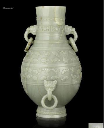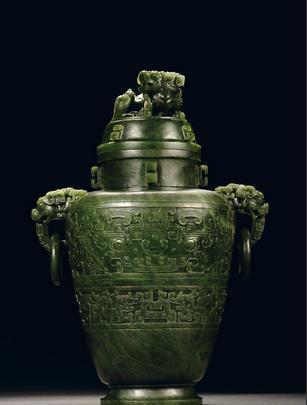 该器采用上好碧玉制成,色泽温润,细腻苍翠。造型仿青铜器,器型庄重,运用浮雕雕琢纹饰,繁复华美,装饰效果极强。盖钮及颈部出戟,顶部圆雕狮钮,傲立雄踞,望天吼啸,卷尾飞扬,灵动张扬气势非凡。瓶肩生双兽耳,饰以大内经典装饰,下衔活环,静美异常,瓶身仿青铜器兽面纹,下为夔龙纹。处处彰显古雅朴拙的唯美,具有乾隆宫廷治玉的风范。瓶底落“乾隆年制”四字楷书款。