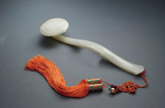 白玉如意以整料和田原石一体成形,作云叶式首,首面四周起云头纹边框,边框内正中央先以剔地技法勾勒出宝象驮瓶的形象,然后再以压地隐起技法琢刻宝象的细部纹饰。宝象回首摇鼻,首及身躯系有璎珞,四肢直立,象背并披有垂穗鞍毯,鞍毯上浅浮雕瑞芝蝙蝠江崖海水纹,寓意「福寿如意」。另外,象背所负的瓶内插有折枝灵芝,又与宝象连结为「太平有象」的美好祝祷。