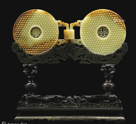 清时匠人或以宫中旧藏古玉连璧为蓝本,然活动镂空璧心,则似为清朝新创。此品璧心,一饰太极图,象征宇宙本源,阴阳混沌,周而复始,另一璧心则雕黻纹,是谓明辨,有帝王明辨是非、知错能改之寓。相连二璧之小玉套环,背面凸雕谷粒排列而成之「洛书」图案,古又称「九宫图」、「九宫算」,或西方所谓之「魔方」或「幻方」,其竖排、横列或对角总和皆相同,此套环上之每列总和则为十五。洛书,最早见于西汉 ,相传乃苍天授予贤君之图象、数列。二璧心镂宇宙、贤帝之征,配以套环之饰,犹如天赐明君洛书,恰到好处。