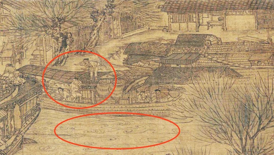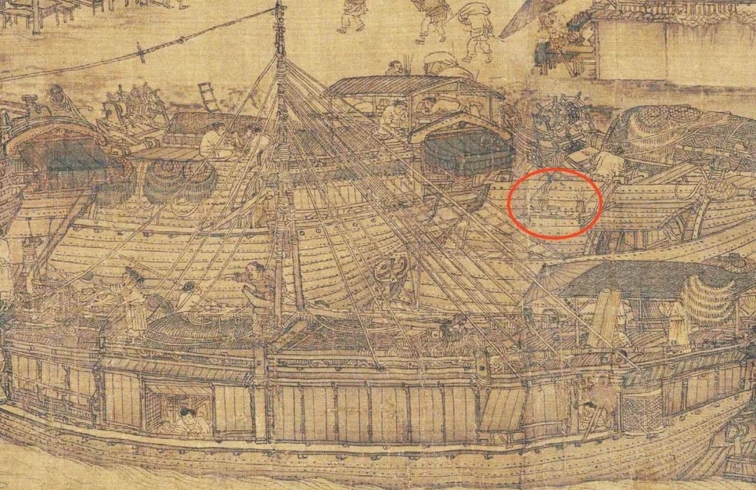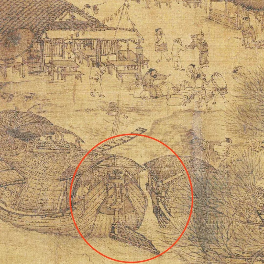 画面下方,可以看到当时的船只已经用上了能灵活转向的平衡舵,北宋的造船技术在当时的世界遥遥领先。