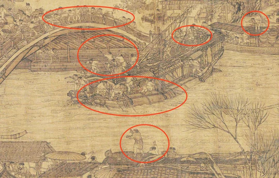拱桥上下的行人大声呼喊,纤夫闻声松开绳索,船工有的掌舵、有的撑篙、有的掷缆绳、有的放桅杆,有的用长杆顶住桥洞,一片纷乱紧张。桥上的吃瓜群众也驻足观看,有5 个人已经翻过栏杆准备见义勇为,一时间眼花缭乱,鼎沸一片。