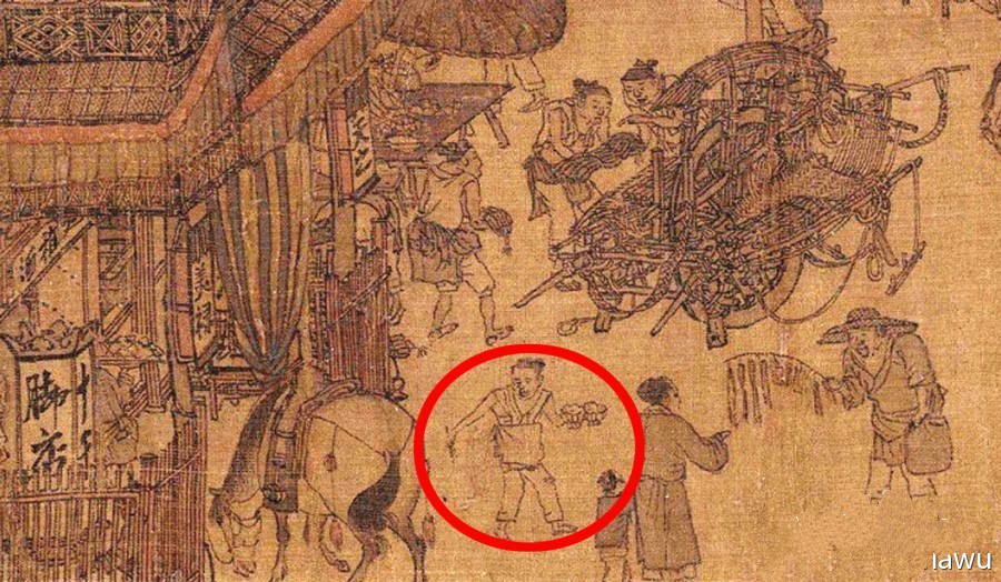 下面有个拿着两份外卖的“饿了么”小哥。宋朝汴京的餐饮业发达,饭店已经开始提供“逐时施行索唤”"“咄嗟可办”的叫餐业务,和今天一样,懒得出门也可以轻松在家当死宅。