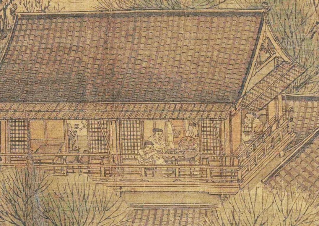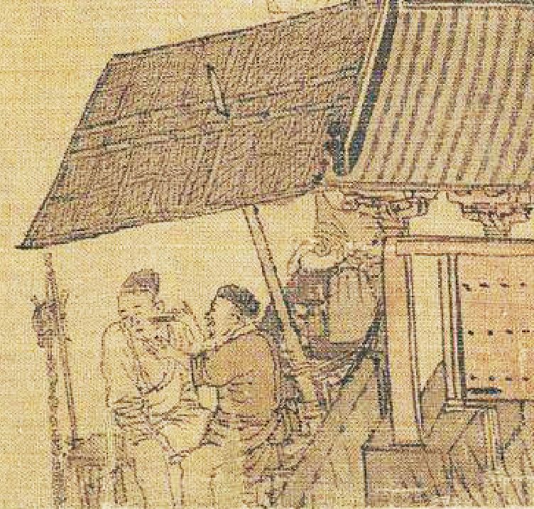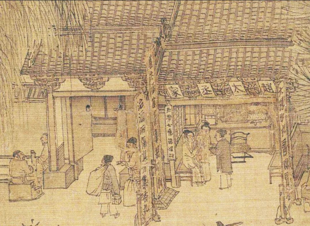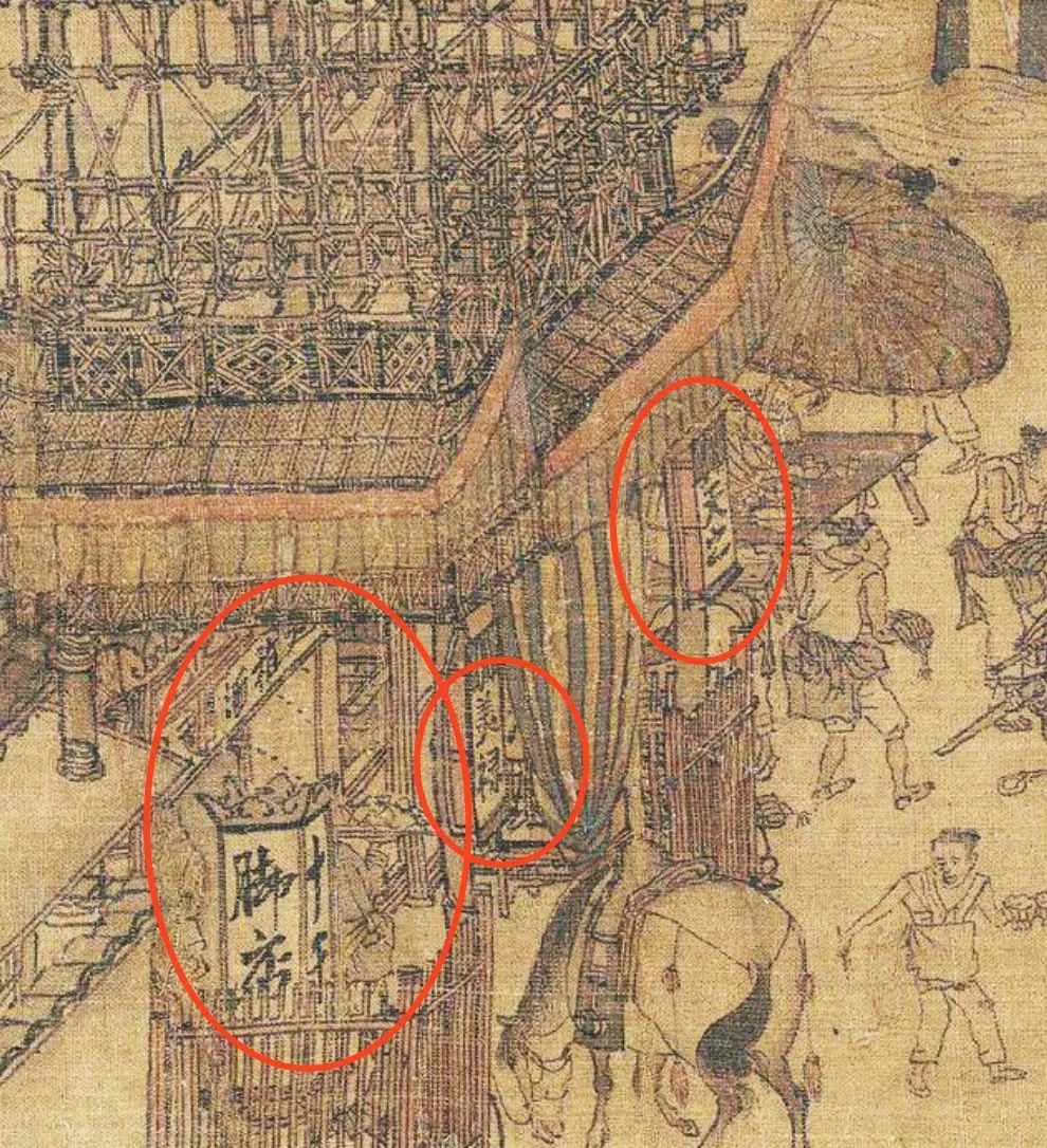 这是汴河边的一家茶坊,宋人酷爱喝茶,茶坊就像今天的咖啡馆。宋茶有七大类,白叶茶、柑叶茶、早茶、细叶茶、稽茶、晚茶、丛茶。宋朝茶坊名字特别奇怪,比如:朱骷髅茶坊、一窟鬼茶坊、大街车儿茶坊、黄尖嘴蹴球茶坊……