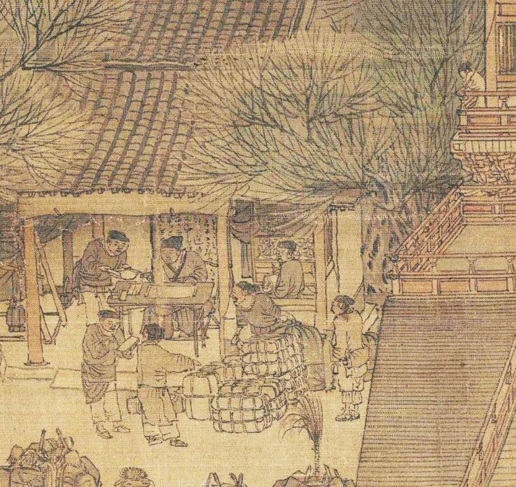十四 进城先报税,第一家商铺就是税务所。四个车夫运来一麻包纺织品,却与税务官吵了起来。由于宋徽宗作风奢侈,北宋赋税相当繁琐沉重。这不,里面的人一脸不悦,音量大到路人侧目。这场纠纷,是当时紧张的官民关系的缩影。
