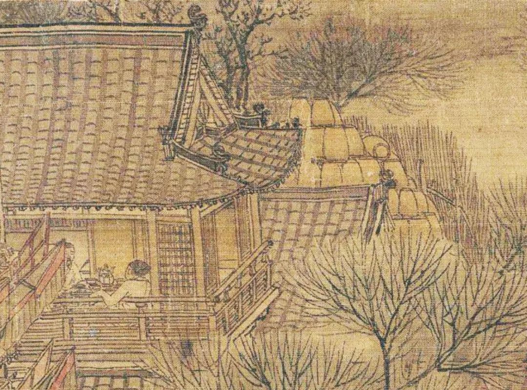 正店酒楼背后是一片树林,一圈栅栏围着一堆大缸,缸口朝下足足叠了4 层,这是店主为酿酒而特意储备的,纵观全图,整个汴梁城嗜酒的人可当真不少。