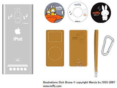 苹果iPod nano现在已经成为不少企业或者公司纪念庆典的专用道具,日本东京宽带公司将推出miffy兔子的限量版iPod nano,虽然售价不菲,但是只发售500套的数量还是相当诱人的,更何况是特别定制的套装版本。这款定制机在机身背面用激光刻蚀上了兔子的图案,并且随机附送有真皮包、挂绳以及登山扣,而且Click Wheel部分也有特别的贴纸来保护。