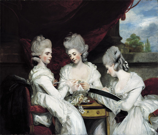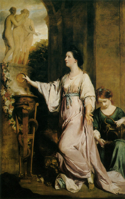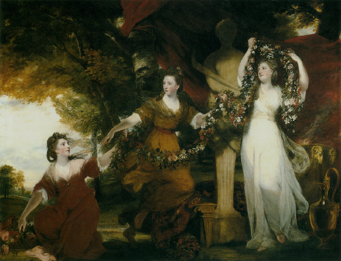 从古典艺术中吸取灵感,发展英国本土的历史画和高级艺术,一直是雷诺兹的梦想。而当时英国的收藏家瞧不起本国的画家,认为他们最多只能画画肖像而已,而历史画则必须到意大利去订购。所以,当时的英国画家没有人能卖出自己的历史画,即使是影响最大的霍加斯也是如此。为了打破这种局面,雷诺兹可谓费尽苦心,他在肖像画中把现实人物肖像画与历史画结合,创立了一种“高雅肖像画”。他让肖像人物穿着古典神话的服装,扮演着历史画的角色。《蒙哥玛利爵士的三个女儿》就是这种“高雅肖像画”的顶点。在这里,他把蒙哥玛利家的三位小姐打扮成古代希腊婚姻之神的女祭司模样,充分体现了杰出的古典文化修养和技巧,因为这幅作品是中间那位少女的未婚夫为他们的婚礼专门订制的。雷诺兹用这一典故暗示出这一肖像画的意义,而同时又用这种特殊的形象处理使肖像画具有了高级艺术的地位。这种表现方法也深得顾主的欢心,贵族少女以古代女神的面目出现,在婚姻女神的胸像上装饰鲜花花环,表现她们对未来婚姻生活的憧憬,这种神话化的处理远比一般的肖像画更富有诗意。