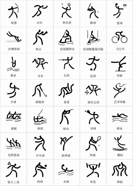 北京奥运会体育图标以篆字笔画为基本形式,融合中国古代甲骨文、金文等文字的象形意趣和现代图形的简化特征,符合体育图标易识别、易记忆、易使用的要求。