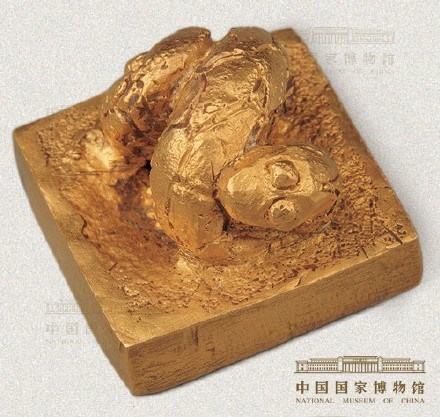 公元前109年,汉武帝策封滇国王为滇王,发给“滇王之印”,让其继续统领其人民。需要说明的是,它只是一枚殉葬印,汉武帝赐的金印还要为后继的滇王在世间使用。古滇国没有自己的文字,所以这枚滇国国王的印章是用汉字写的。请大家注意印章上的“王”字,它中间的一横是靠上的,古时候的“王”字就是这样写的,如果把中间的横写在正当中的话,在古代就不念“王”了,而是念“玉”。