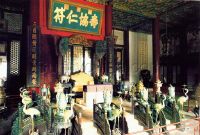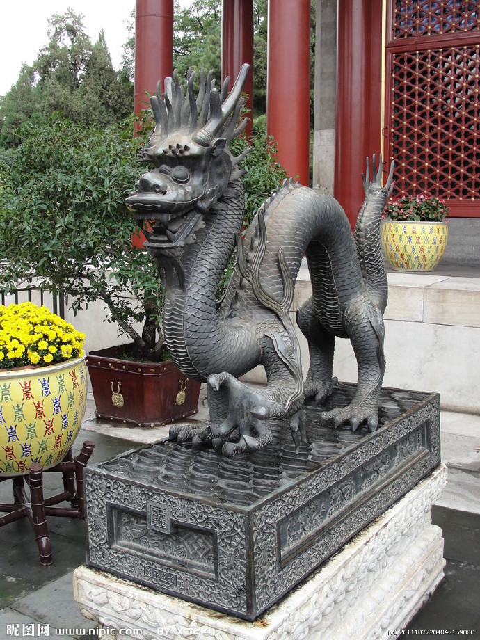 仁寿殿的前面摆放着铜龙、铜凤,按照地位的尊卑铜龙地位高应该摆放于内侧,铜凤地位低应该摆放于外侧,但是我们看到摆放的位置恰恰相反,铜凤摆放到了内侧,铜龙摆放到了外侧,这是由于当年实际的权力是掌握在慈禧的手中的,所以铜凤被摆放到了尊贵的位置。我们会注意到在铜龙和铜凤上铸有“天地一家春”的款识,“天地一家春”是当年慈禧在圆明园中居住过的地方。