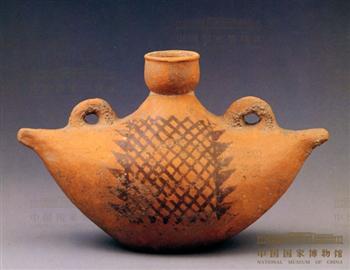这是一件仰韶文化时期的船形彩陶壶,它宽肩小底,两端上扬,尤其是壶身腹部装饰网纹,表现的正像是人们从河里收网捕鱼或者捕鱼结束将网搭在船边晾晒的情景。造型设计与装饰纹样都让人联想到渔船、渔网、捕鱼活动等水上生活场面,堪称造型别致的艺术品。