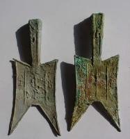 3、圆钱。圆钱主要在秦和赵、魏的黄河流域地区流行。钱的重量用“铢”来计算,当时秦朝铸有“半两”钱,分量相当于十二铢,这已经是很重了。在秦朝的时候黄金24两等于一万钱,到了汉朝初年是黄金16两等于一万钱。4、蚁鼻。蚁鼻钱是江淮流域楚国流通的货币,是从仿制贝币转化而来的,蚁鼻的上面有类似鬼脸的图案,但它的意义现在已经不知道了。5、郢爯(音:影称)。郢爯也是在楚国流行的货币,它是黄金做的,“郢”是地名,是楚国的都城,“爯”有“称量”的意思。