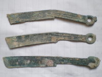 先秦时期的钱币主要分为5种:1、布币。布币是目前发现的最早的官铸金属货币,这种形状如同金属铲的货币来源于农具,称为“布”,“布”是农具“镈”(音:博)的假借字。布币分为空首布和平首布,空首布是指上端首部铸成了如同农具一样,有装柄的孔,而平首布却没有孔,平首布是由空首布演变而来的。使用布币的国家主要有周王室、韩、赵、魏。2、刀币。刀币很少在墓葬中发现,专家认为这或许和刀币的形状像刀有关,刀是宰杀之器,不吉利。刀币的末端有一个环,称为“刀环”,刀环的直径与刀身的长度比例,与人的头部和身高的比例接近,据《周礼·考工记》记载将6枚刀币首尾相接就可以围成一个环。齐国使用刀币,齐国为了发展经济,规定如果外国商人带一车货来做买卖,可以免费就餐,如果带三车货来做买卖,齐国就免费喂他的马匹,并提供住宿和女佣人等。燕国的刀币上往往刻着“明”字,俗称“明刀”。使用刀币的国家主要有齐、燕、赵等地。