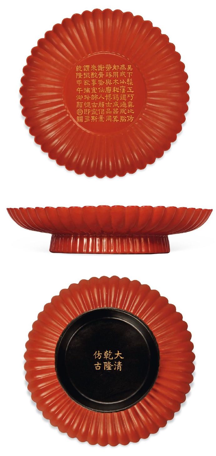 盘身菊瓣形,浅腹,圈足。通体仿朱漆釉,盘心微隆,金彩隶书乾隆御题诗: