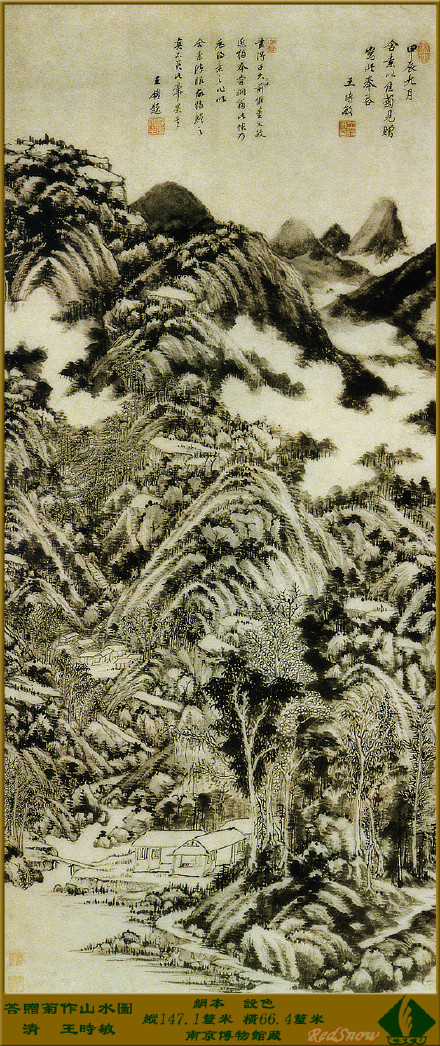 这件作品是王时敏为答赠含素以佳菊相赠而作的山水画,画中描绘了一个众岭重叠的深山景色。山上林木密布,远山之腰,云腾雾绕,有似游龙,一直向纵深之处延伸而去。左侧山谷之中,庭院深深,楼阁掩映,一条小道拾级而上,在山谷中蜿蜒。周围林木茂盛,浓荫蔽日,真一个清静的好去处。这件作品构景繁复而集中,但因布置有序,因而层次井然,显现出温厚而博大的气象之美。