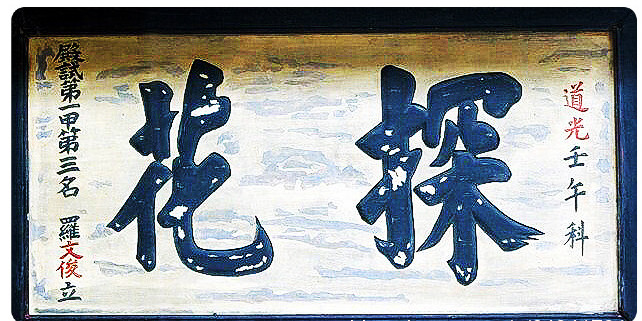 探花是科举殿试考试中对位列一甲第三名举子的称谓,探花与状元、榜眼一起构成进士“鼎甲”的殊荣。探花位置虽然较前者有一定距离,但从文韬武略及个人才学上并不比前者弱,而且涌现出了许多学者、文学家、书法家和朝廷重臣与社会名流。唐代殿试后,新科进士要在杏园举行“探花宴”,以新科进士中少年俊秀者为探花使,亦称探花郎,骑上高头骏马,踏遍长安城的名园,采折早春的名花,孟郊的“春风得意马蹄疾,一日看尽长安花”的诗句便源于此。到了南宋以后,探花便专指殿试进士第三名。自隋唐以来至清末,计有331名举子题名探花。