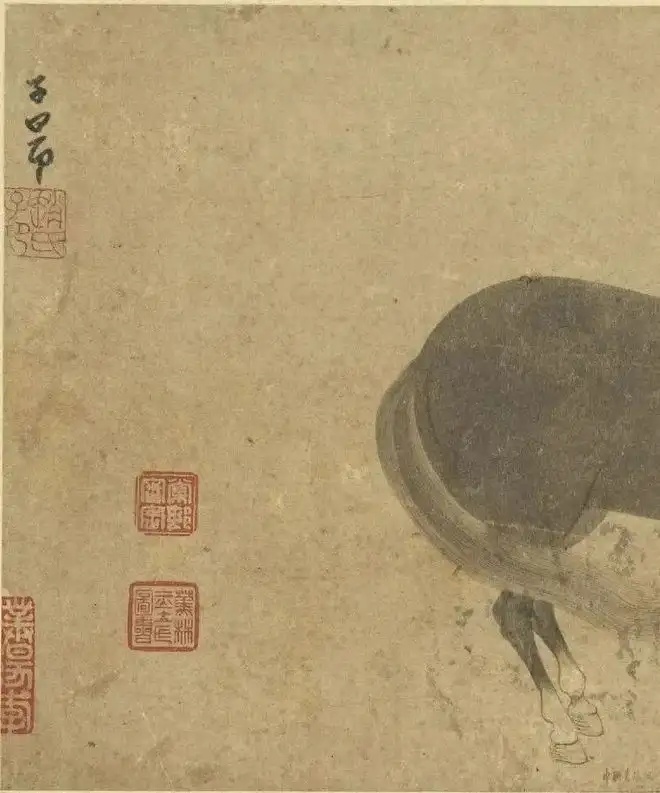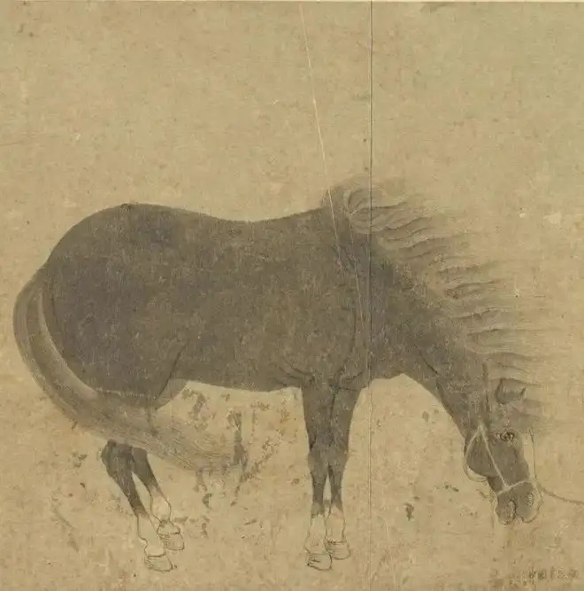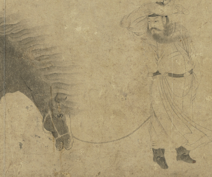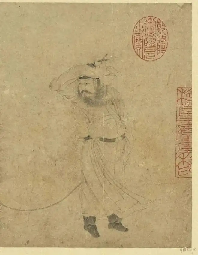 古道西风瘦马,有种萧疏清远气,与汉马的剽悍、唐马的华贵不同。疾风中的白衣驯马手,“调良”即驯化马匹之意。风中扬手遮面,袍袖衣襟与鬃须飞动。马的鬃毛,逆向横飞。细劲的中锋笔法,高古游丝描,生动传神。