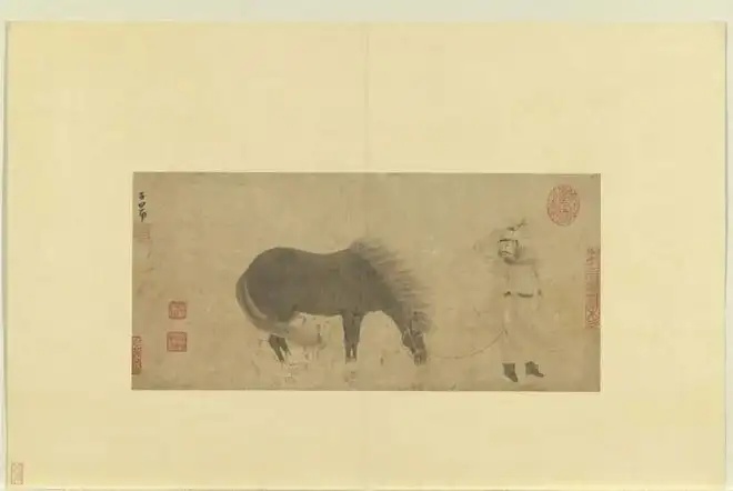 此图是赵孟頫所画人马图中很有名的一幅。图中所画的一匹马和一个牵马的人原本是静止的,然而却因大风的袭来增加了画面动感,这是画家匠心独具的地方。画上款署“子昂”,下钤“赵氏子昂”印一方。