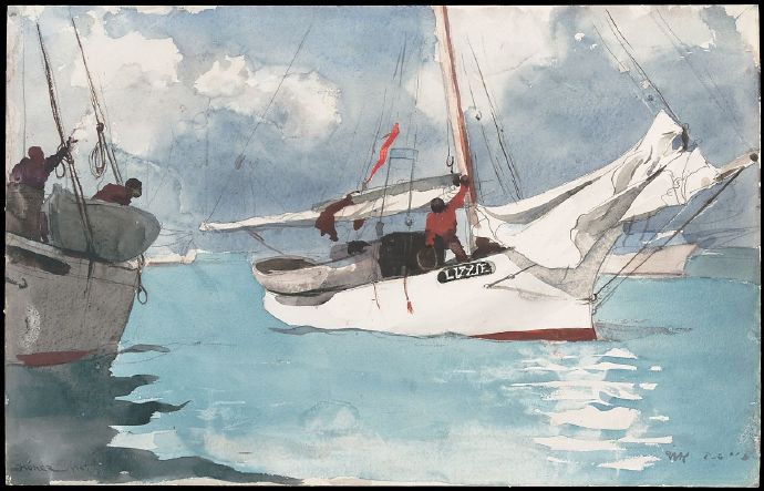 荷默的水彩画很少能与这一幅相媲美,因为它的效果是通过在湿洗中快速施湿、广泛而灵巧地利用白纸储备以及明智地吸干湿颜料,尤其是在阴影中,反射水中的光。这幅画的铅笔标记的数量和可见性也是不同寻常的,它不仅显示了一些船只的索具(并在艺术家删掉的背景中泄露了单桅帆船的底纹),还活跃了被幻影微风掀起的帆布的沙沙声。相比之下,荷默以精湛的方式,只是徒手画出人物,没有牺牲他们的形式和重量,感觉他们甚至似乎在相互说话。