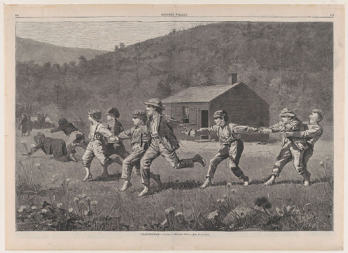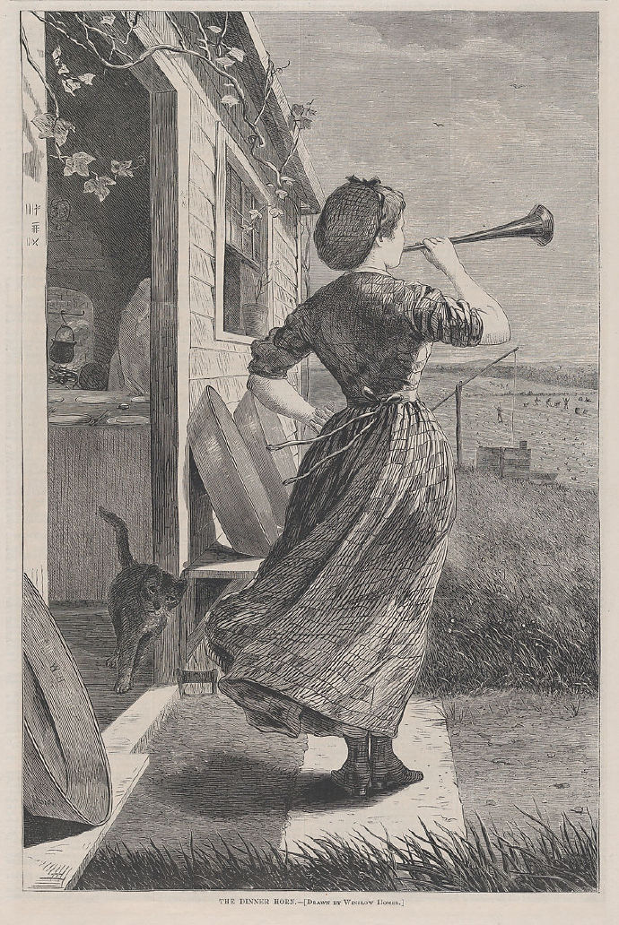 1857年,温斯洛·荷默(Winslow Homer)开始了他18年的职业生涯,为同年在纽约发行的《哈珀周刊》当插图画家。该出版物是插图周刊最成功的例子之一,这是一种以图像而非文本为主导的杂志。得益于木材雕刻技术的最新进展,周刊可以快速、廉价、大量地印刷出来,在木材雕刻技术中,图像被转移到木块上,然后用蜡模电解铸造。荷默职业生涯早期是一名自由插画家,在美国内战爆发时( 1861 - 1865年),他被哈珀雇用为全职记者。他每周的工作范围从从前线观察到的战时场景到唤起美国农业历史的怀旧观点。