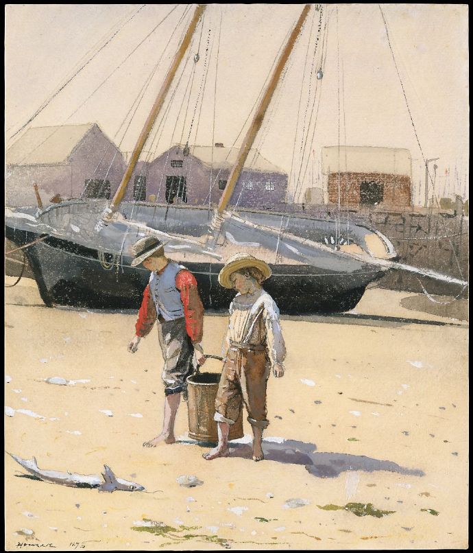 1873年6月,荷默去了马萨诸塞州的格洛斯特,在那里他画了他的第一幅水彩画,描绘了当地的孩子们在多莉斯玩耍,坐在码头上,帮忙做家务,或者只是全神贯注于自己年轻时的担忧。那个实验夏天最令人愉快的产品之一是“一篮子蛤蜊”这是博物馆获得的他最早的水彩画。这位艺术家在这幅迷人的画面中总结了童年的责任,画面中两个男孩提着一大篮子蛤蜊沿着布满贝壳的海滩走。背景建筑和裁剪的双桅帆船是指格洛斯特的海上活动。这张迷人的作品代表了荷默的第一幅水彩画的直接观察、有力的设计和耀眼的光芒。他作为插图画家的经历在他的图案感、清晰轮廓和平面水洗的运用以及对细节的关注上有着明显的提醒。荷默和19世纪70年代的许多美国艺术家都对童年感兴趣。他们的绘画回应了后内战时代的精神,当时对国家康复的渴望以及城市和工业发展的挑战使儿童成为一个更简单、更纯真的时代和美国未来希望的象征。