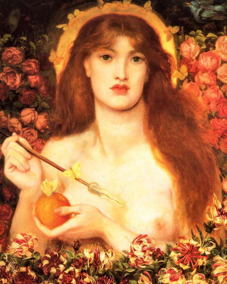 英国1851年,罗赛蒂邂逅了伊丽莎白.希达尔,这位美貌非凡的女子深得拉斐尔前派画家们的喜欢,她不仅成了他们创作时最美的模特儿,她是他们的学生。这幅画作同样是以希达尔作模特儿来绘制的。这是一个肖像式的构图,背景是美丽的鲜花,维纳斯的头略略抬起,修长的颈项,有着一种优雅的情调,这是典型的罗赛蒂所创造的女性形象,恬静、文雅、秀丽,充满着幻想与迷惘的憧憬,有着超凡脱俗的品格。