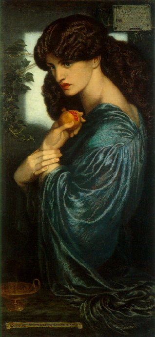《珀尔赛福涅》表现的是古代希腊的神话,珀尔赛福涅是农神的女儿,被冥王抢到冥界做了他的妻子。在罗赛蒂的画中,珀尔赛福涅仍然是以珍妮为模特儿,她身着蓝色的长衫,手拿着石榴在幽暗的冥国深思。她似乎知道吞下石榴子的后果,但仍然在犹豫是否要吃它,她似乎徘徊在爱的欲望和节制之间。石榴子象征着姻缘的不断,而这姻缘又是以沉沦于黑暗王国为代价的;她身后远处的光明象征着节制与亲情,这光明对她也有莫大的诱惑。女郎在光明与黑暗,放纵与节制、性爱与亲情之间犹疑,内心充满矛盾,挣扎在欲望的诱惑之中。
