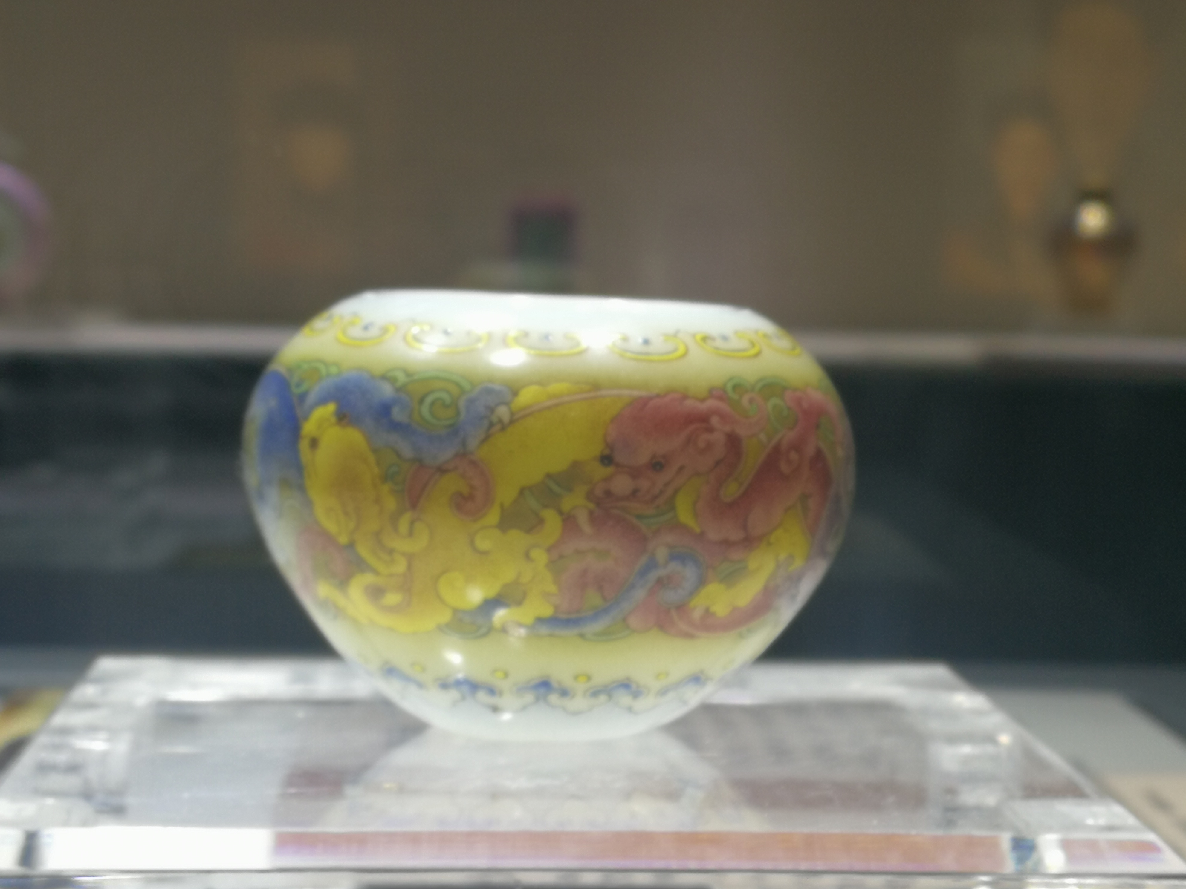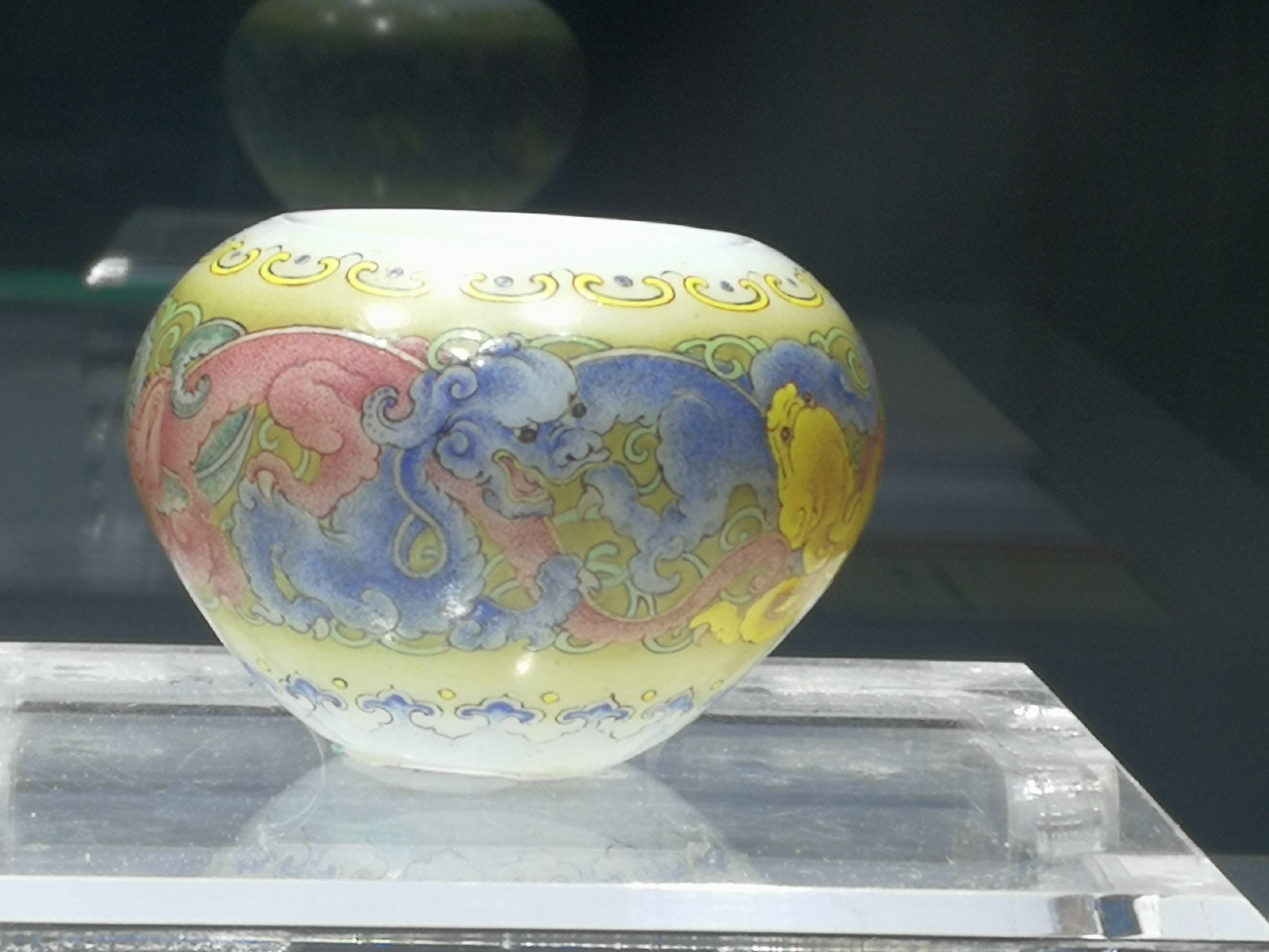 本水丞扁圆形,溜肩鼓腹平底,涅白料胎上绘珐琅彩。玻璃胎光滑亮洁,温润如玉,绘画笔法细腻传神。丞身除口底外,遍施赭黄地,中间画珐琅彩蟠螭龙纹,龙纹上有娇黄色卷云纹花边,下出如意云头文,首尾呼应,圆润可爱。