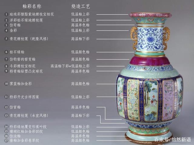 这件各种釉彩大瓶,汇集各种高温、低温釉彩于一身,集中体现了清代乾隆时期景德镇御窑厂的制瓷水平。从烧造工艺上看,青花与仿官釉、仿汝釉、仿哥釉、窑变釉、粉青釉、霁蓝釉等均属高温釉、彩,需要先行焙烧;而粉彩、珐琅彩、金彩及松石绿釉等属于低温釉、彩,需要后烧,不可颠倒次序,否则低温釉、彩就会受到破坏。