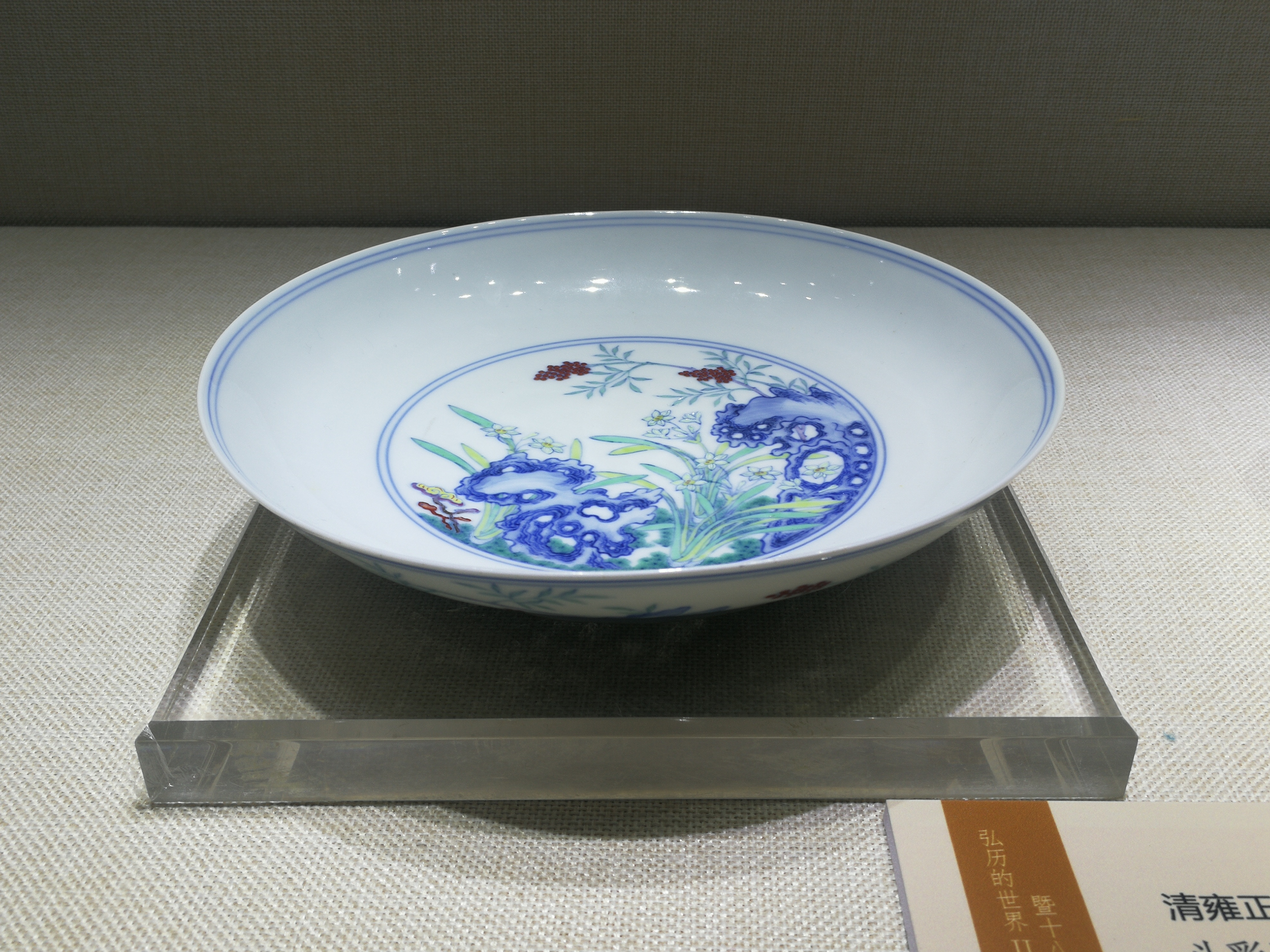 此器中所绘灵芝、水仙、南天竺和翠竹,寓“芝仙贺寿”之意,是雍正时期的常见纹饰。北京故宫博物院所藏《雍正行乐图》册页中的“书斋写经”图,画中雍正身穿汉服端坐案前,执笔抄经,门外秀石旁生有南天竺、水仙,仅未见灵芝,其构图、设色、场景与本盘之纹饰非常相似。雍正皇帝对此种纹样的珍爱与重视,由此可见一斑。此册页中均用写实场景,据此推测,本盘之纹饰应由宫廷画师依照该图设计,雍正御批后由御窑工匠临摹于盘上。