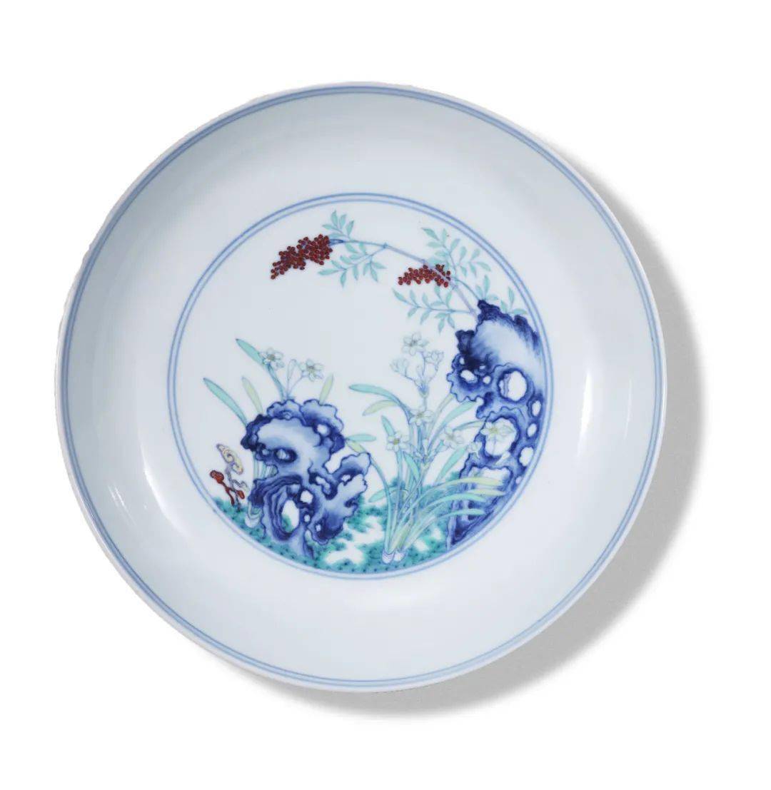此器成对,均为敞口弧壁,底为圈足,质地坚白,抚之光润。对盘通体以斗彩设色,青花淡雅,釉彩婉柔,隽秀蕴藉。盘心饰芝仙贺寿图,只见洞石对立,南天竺舒展,果实累累,水仙芬芳,揽春吐艳,灵芝倚石,静默暗香。外壁绘三组图案,由洞石分别和灵芝、水仙、南天竺和翠竹相互构成,与盘心呼应,独运匠心。底饰青花双圈内书“大清雍正年制”六字双行楷书款,字迹隽永。