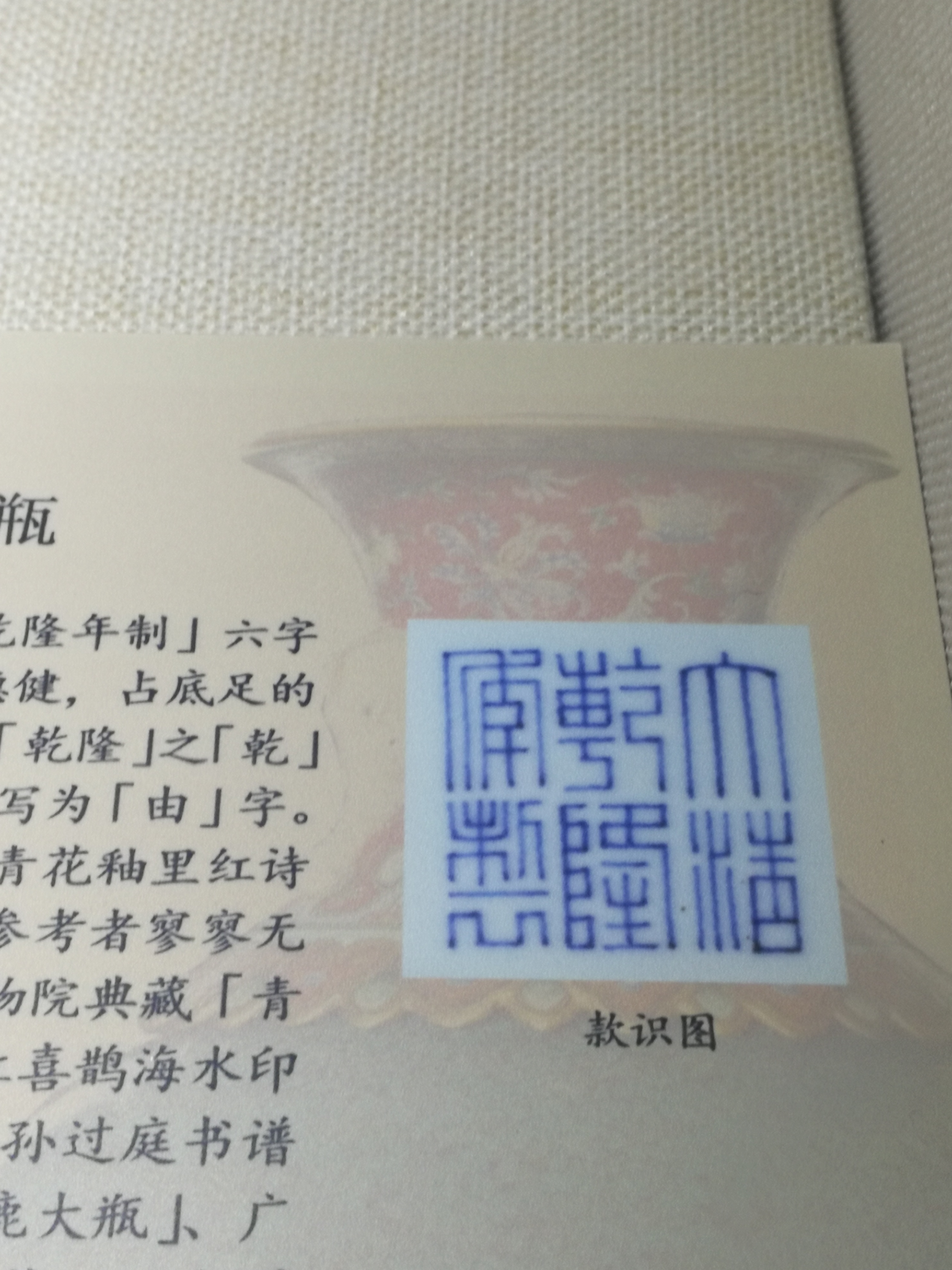 此瓶青花发色苍雅淋漓,底落《大清乾隆年制》六字三行篆书方章款,间隔疏朗,大气而稳健,占底足的面积比例明显大于一般官窑琢器。并且《乾隆》之《乾》字书写篆法别具一格,将左边的《曰》字写为《由》字。检视当今存世实物,上海博物馆收藏《青花釉里红诗句笔筒一对》与之相同,但此类写法可参考者寥寥无几,颇为珍罕,其余几例尚见北京故宫博物院典藏《青 花釉里红海天浴日图印盒》《青花釉里红喜鹊海水印盒》、北京国家博物馆藏《青花釉里红临孙过庭书谱笔筒》、香港望星楼典藏《青花釉里红松鹿大瓶》,广东博物馆收藏《青花隶书诗文笔筒》等几件。以上列举器皿都具有乾隆早期御瓷的典型风格,写款无疑皆出一人之手,上博、国博藏笔筒上更有唐英《陶成堂》落款:此外,上博藏有一例《粉彩米芾赐砚图唐英题诗笔筒》诗句后有“沈阳唐英”落款,如此更一起证明,此类写款器物属于唐英榷陶之佳作。