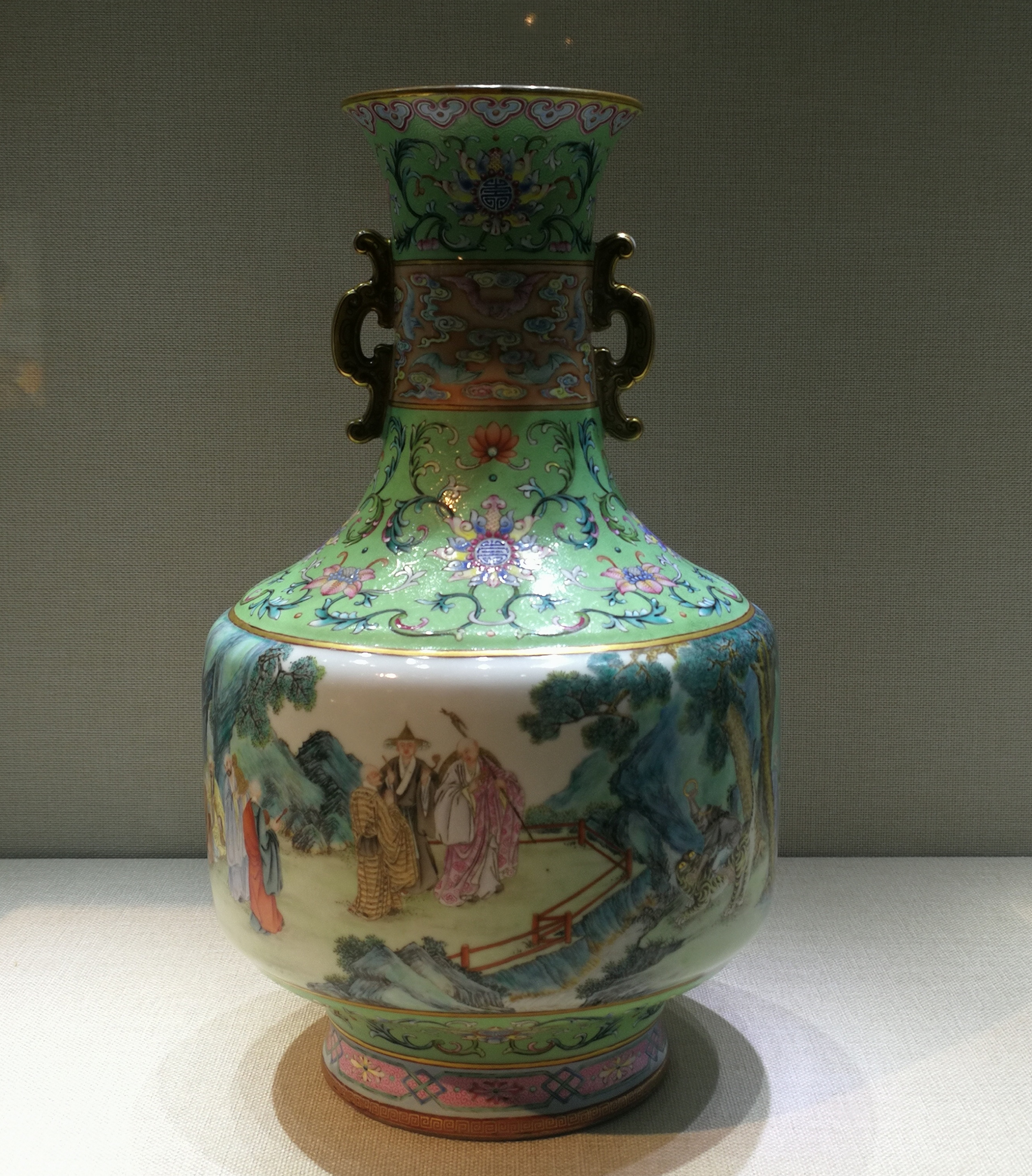 清乾隆洋彩绿地轧道洋花通景“十八罗汉”双耳瓶