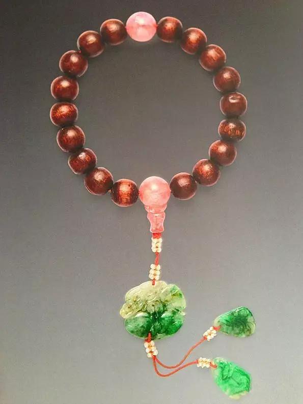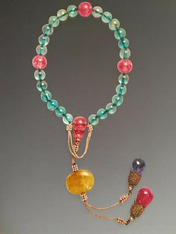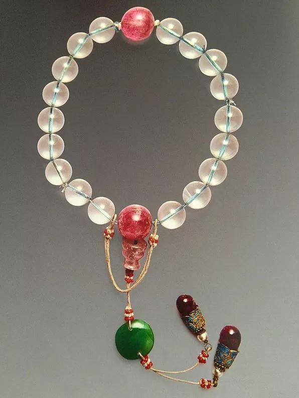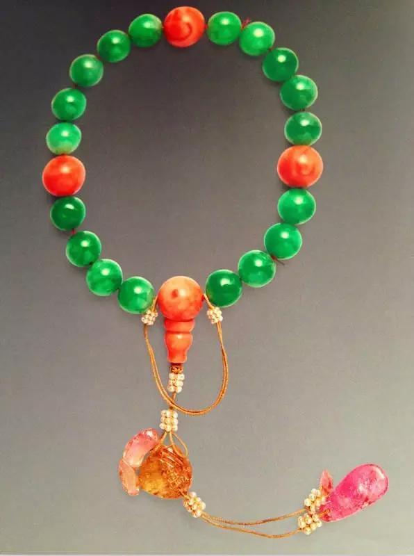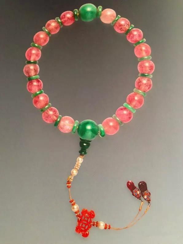 手串,源自念珠。清宫中的手串,选材多用珊瑚、碧玺、翡翠、青金石、玛瑙、蜜蜡、水晶等材质。佛头、坠角多用翡翠、珊瑚、珍珠、碧玺装饰。