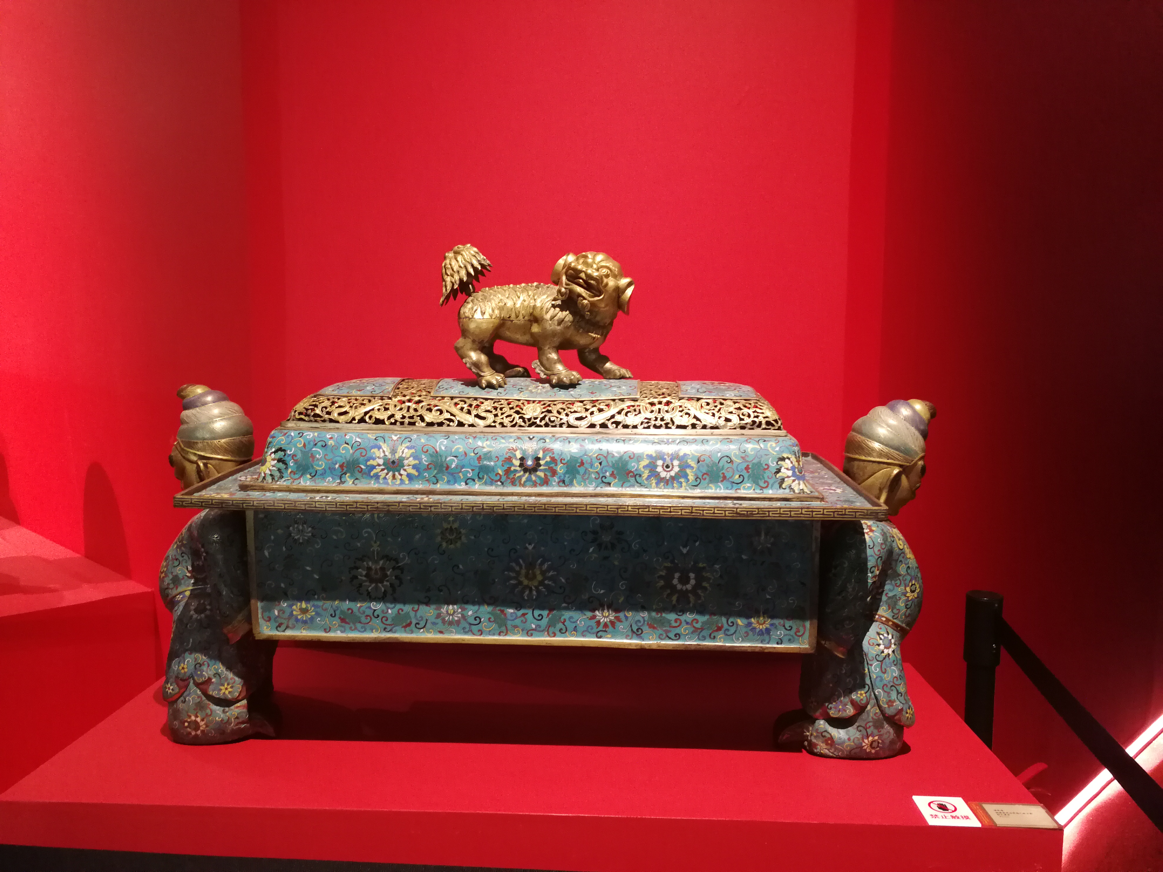 类似形制较大的铜胎掐丝珐琅器通常都是成对制作,英国维多利亚与艾尔伯特博物馆中藏有一件清乾隆铜胎掐丝珐琅香炉。