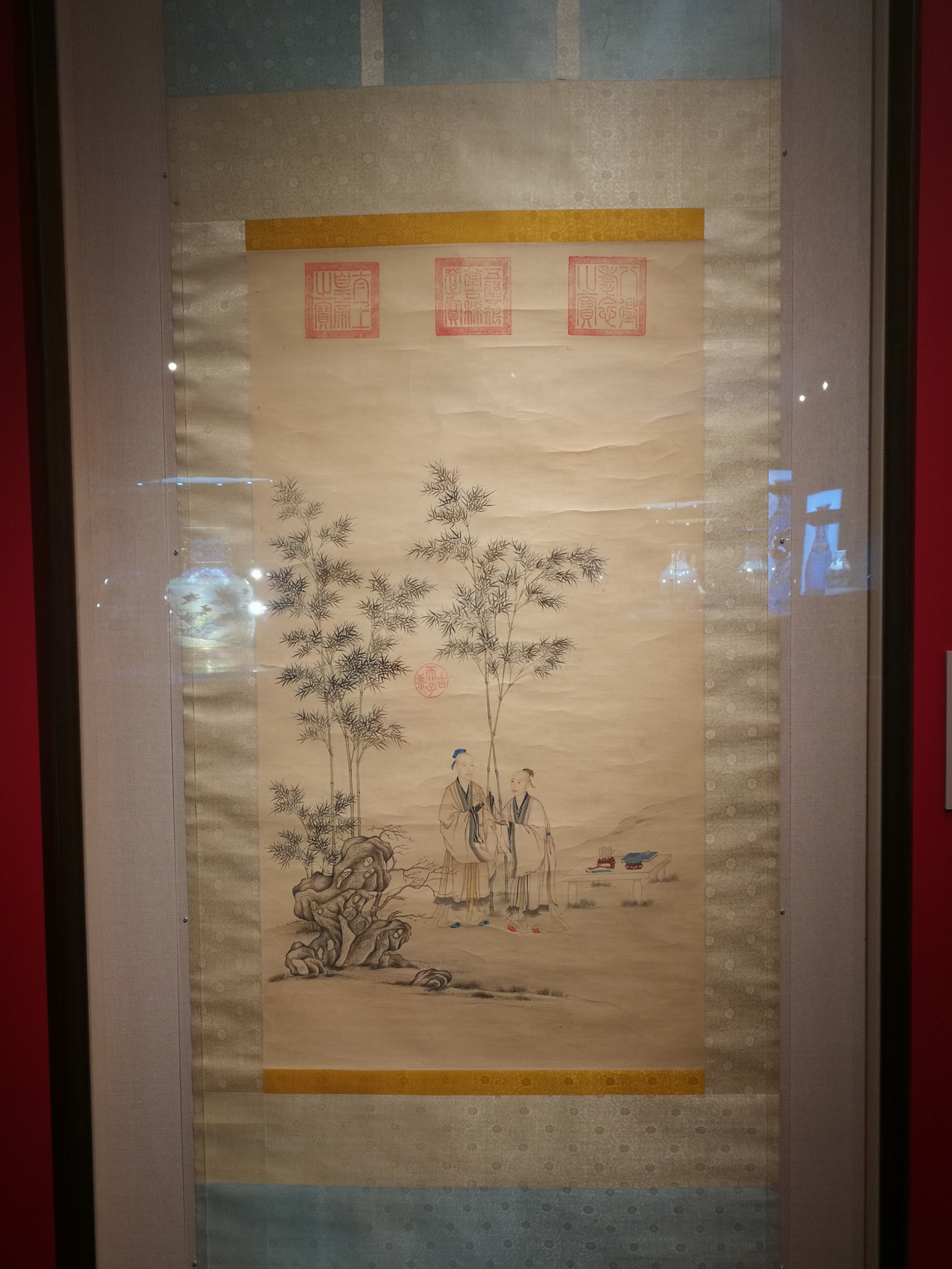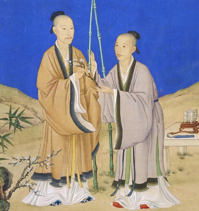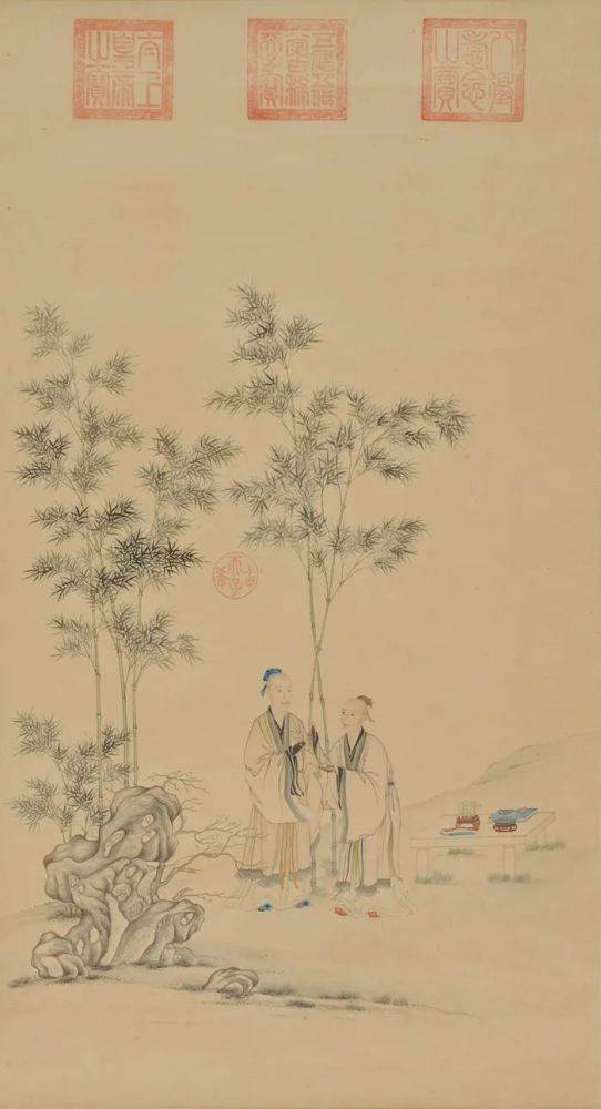 图绘在青竹、寒梅以及湖石点缀的田园环境中,两位身着汉装的男子正在以梅枝相递送,其典雅高贵的举止与优雅的环境相得益彰,情景交融之中加深了画意。据乾隆皇帝晚年所题“写真世宁擅,缋我少年时”而知,此图表现的是乾隆皇帝弘历年轻时的画像。图中唇部无须,脚着红鞋者便应该是十余岁的弘历。作者虽然在画幅上没有落名款,但是据乾隆皇帝的题诗可知,画像当出自郞世宁之手。郞世宁作为有着深厚素描功底的西洋画家,他在运用西方解剖学将人物五官面部刻画得细腻、清晰,富有立体感的同时,巧妙地吸取了中国传统“写真”画技法,注意减弱西画中的光线亮度,从而避免了中国人所忌讳的阴阳脸的出现,这种中西结合的表现手法具有极强的艺术感染力和令人耳目一新的表现力,得到了清皇室,尤其是乾隆皇帝的高度赞赏。
