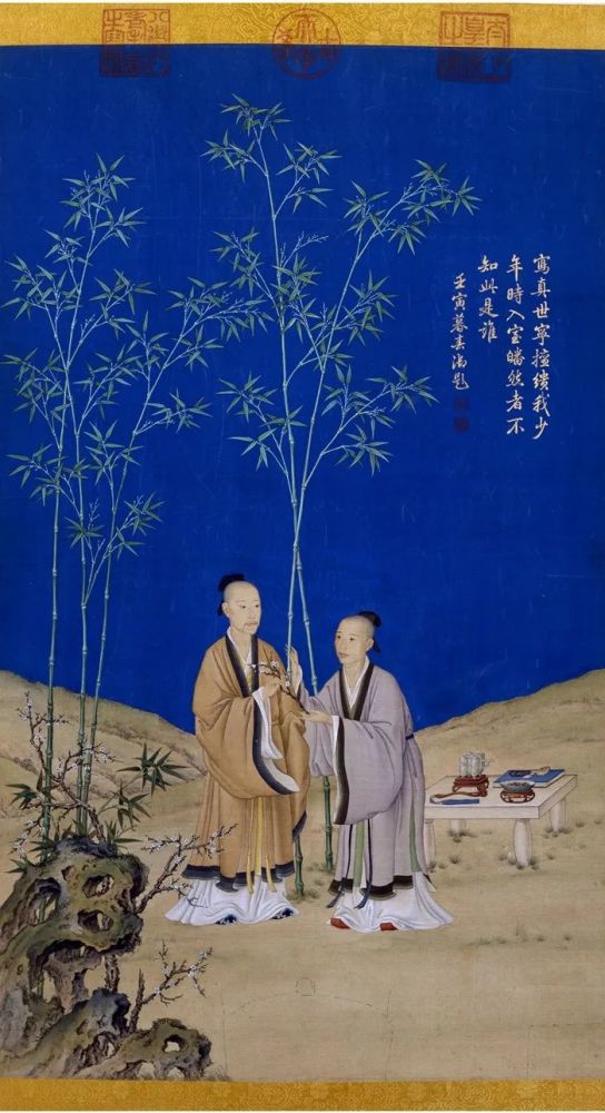 乾隆皇帝御题五言绝句一首:“写真世宁擅,缋我少年时。入室皤然者,不知此是谁,壬寅暮春御题。”这是乾隆四十七年(1782年)的题诗,时年乾隆皇帝72岁,这首诗反映了他对光阴荏苒的感慨。