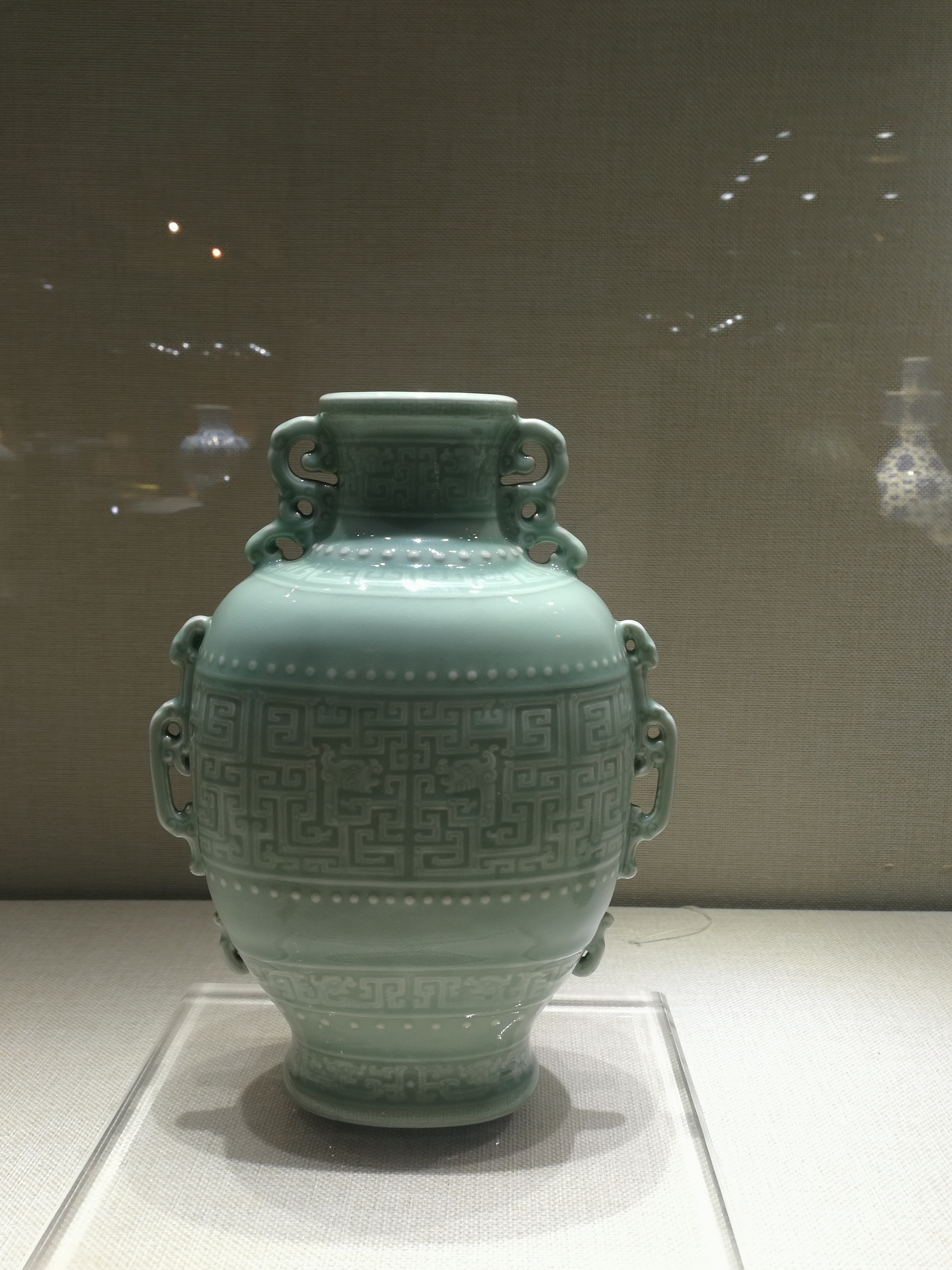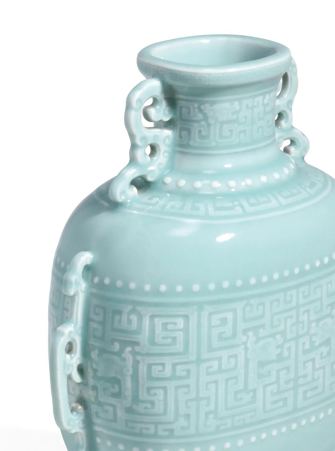 此品呈扁圆形,唇口,短颈,溜肩,鼓腹,收胫,足部略外撇。通体施粉青釉,釉面光润凝腻,有玉之纯净盈透感。器身自上而下共有七层纹饰,均以模印夔龙纹为主,间或点缀弦纹或鼓钉纹一周以示分隔,口沿及近足处以回纹装饰,两侧自口沿至下腹均有镂空的卷草纹耳,纤细曲折极易损毁,如此完整保存至今实为不易。底刻「大清乾隆年制」六字三行篆书款。整器纹饰、器形均完美对称,以极佳的视觉平衡为其平添庄重、稳定之感,纹饰及构图颇具古意,典雅质朴。