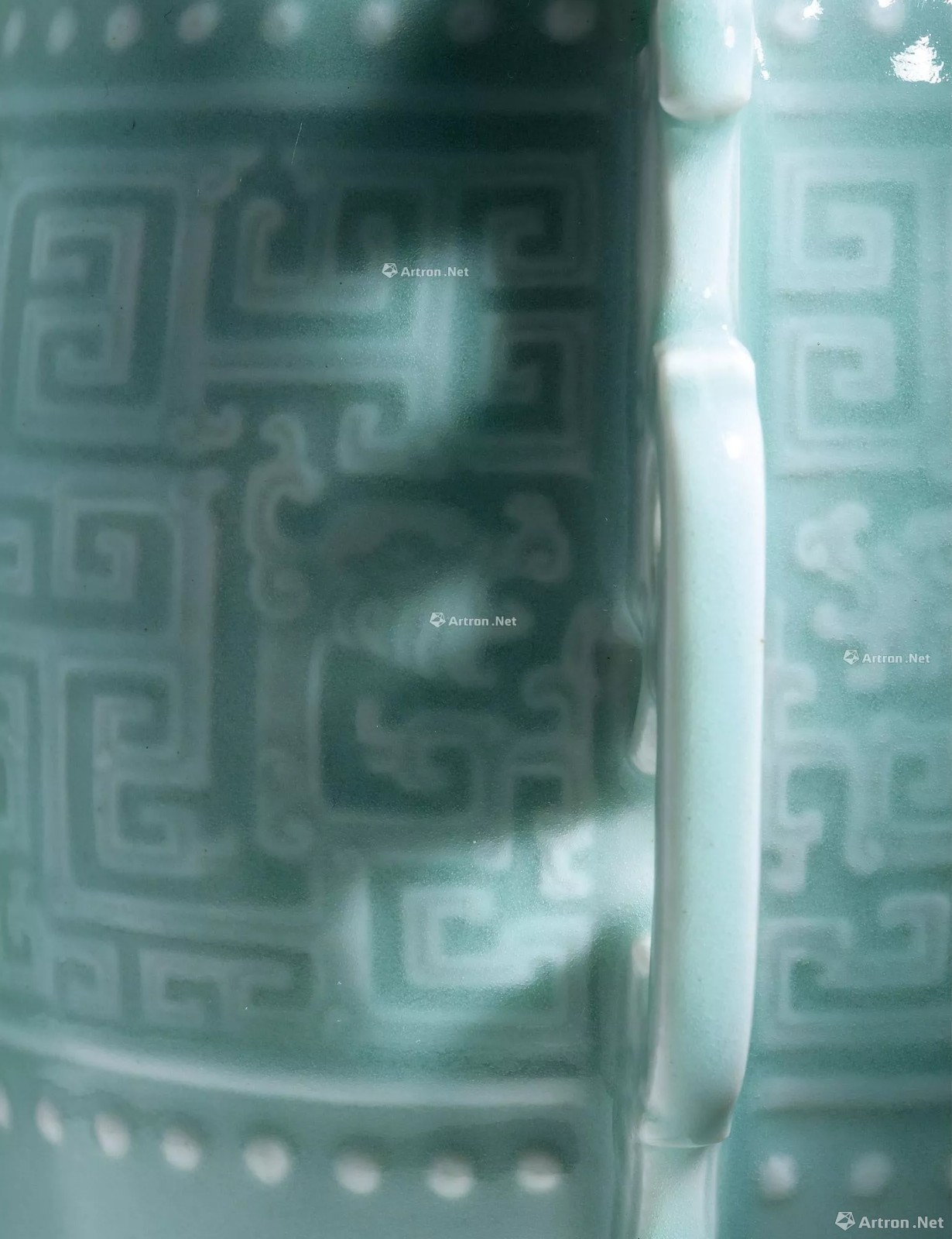 本品通体施粉青釉,釉面光润凝腻。器身自上而下共有七层纹饰,均以模印夔龙纹为主。底刻“大清乾隆年制”六字三行篆书款。整器纹饰、器型均完美对称,以极佳的视觉平衡为其平添庄重、稳定之感,纹饰及构图颇具古意,典雅质朴。在保利厦门2019春拍会以1920.5万元成交。