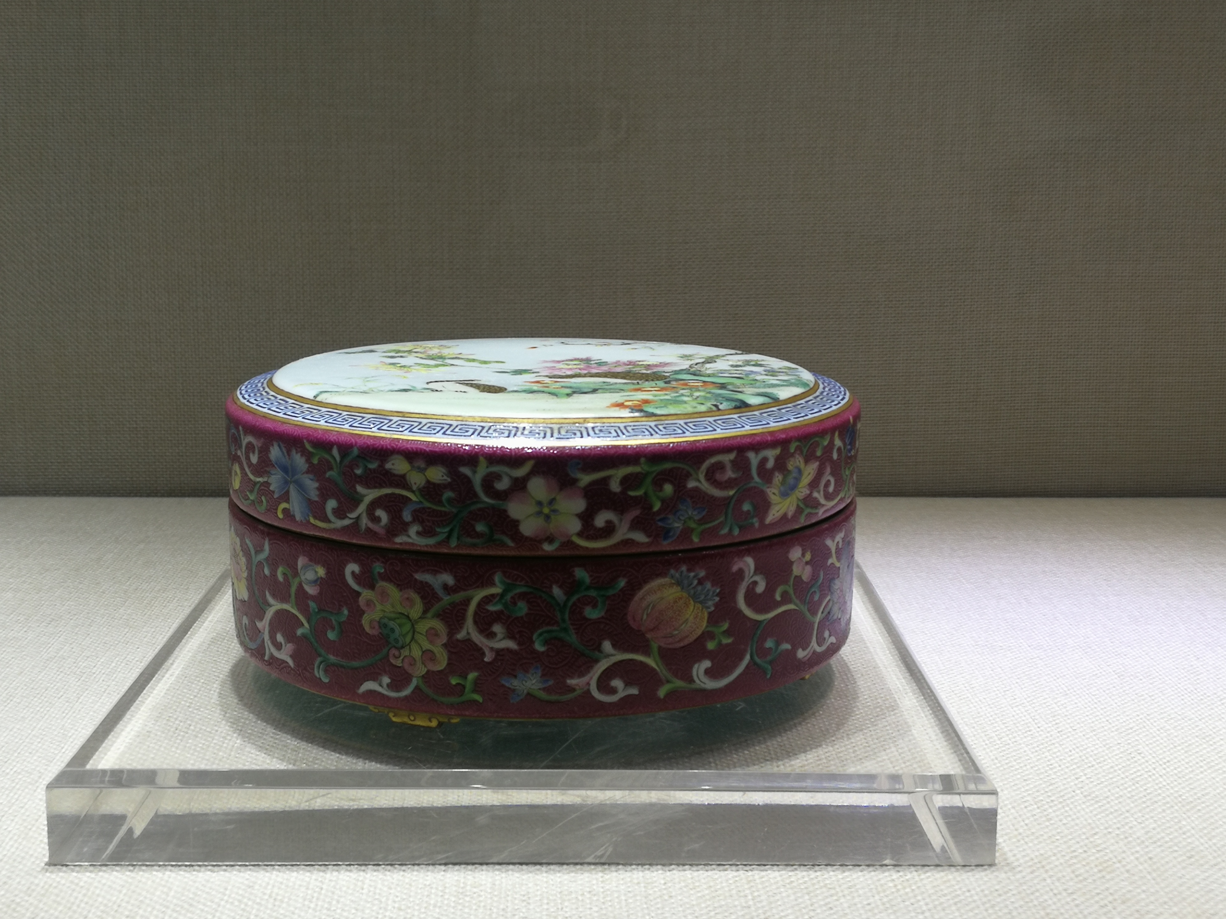 清乾隆胭脂红地洋彩轧道花卉平安春信图盖盒