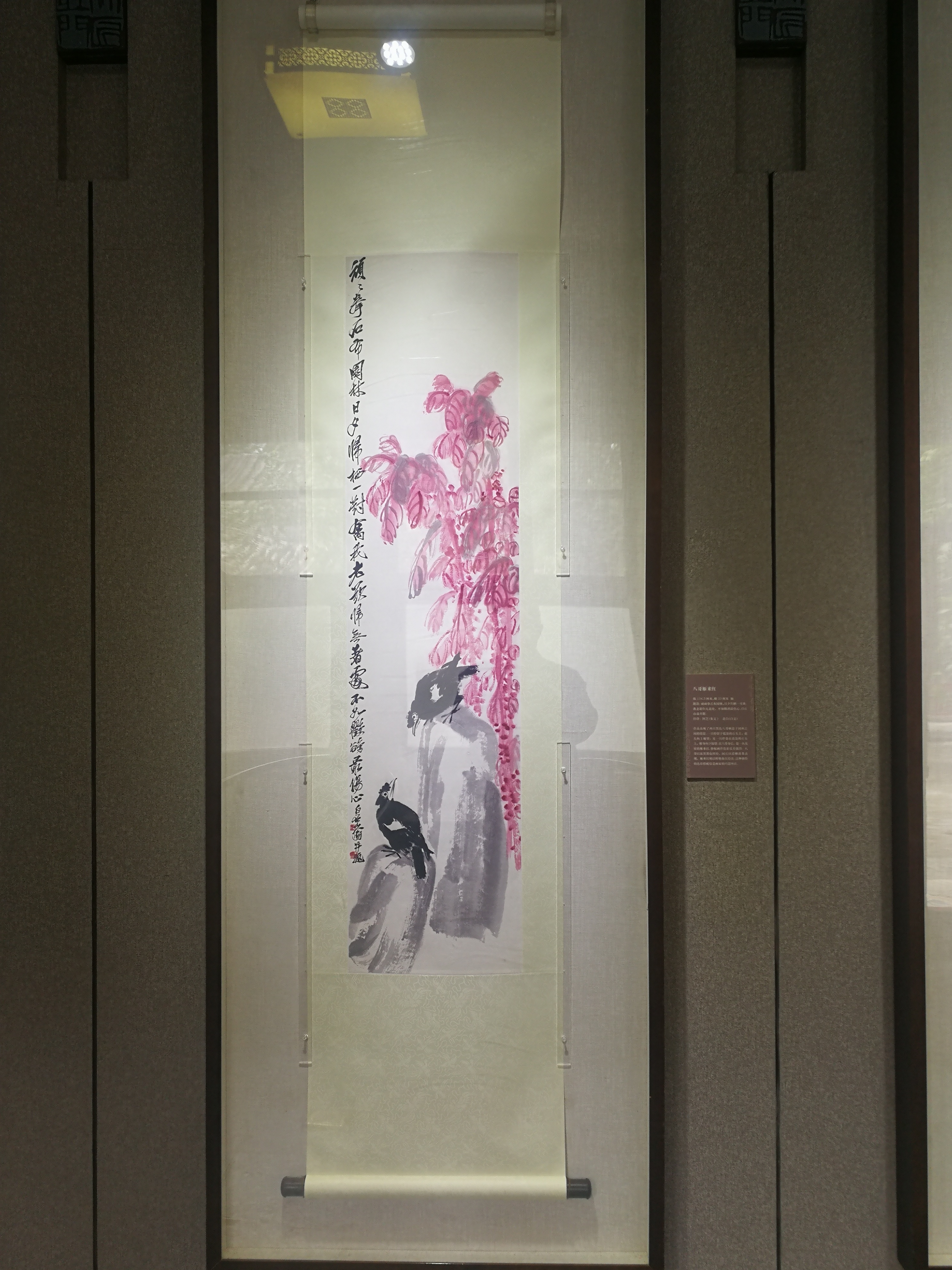 作品表现了两只黑色八哥栖息于园林之间的情景。一只停留于低处的石头上,扭头向上观望;另一只停靠在高处的石头上,俯身向下探望。在八哥身后,是一从茂密的雁来红。整幅画作色彩反差强烈:八哥以浓黑墨色图绘,园石以清雅淡墨表现,雁来红则以鲜艳朱红绘出。这种独特的色彩搭配恰是画家的巧思所在。