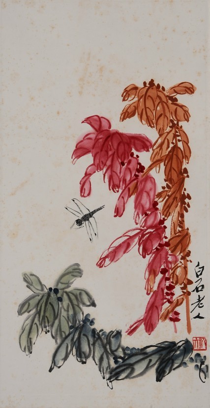 雁来红历来为人喜爱,以之入诗入画佳作多多。宋代杨万里咏雁来红有“开了元无雁,看来不是花。若为黄更紫,乃借叶为葩”的句子,体物入微,为人传诵。历代以雁来红入画的画家不胜枚举,齐白石对雁来红的描绘不但数量大,而且独具特色,成为他的代表性题材。人们一直对齐白石的“红花墨叶”津津乐道,而在墨叶之外,齐白石对红叶也颇有兴趣,雁来红是其中一种。齐白石画雁来红常常以单色为之,略分浓淡,如单用花青作雁来红,就有多件,与红花墨叶或水墨横陈相比,别有一番风味。这件雁来红以娴熟的笔法,以三色点写,叶脉或墨或色,勾勒舒展灵动,散落枝叶间的色点墨点,如高峰坠石,铿然有声,画面生气顿出。一只蜻蜓简笔写出,直挹特征,虽笔墨结实,画面却因之多了几分活泼与生趣。景色自是寻常,一旦入画又如此可观,足见画家经营之苦心与技术之精湛。齐白石习惯称雁来红为老来红,他题画老来红:“四月清和始着根,轻锄亲手种蓬门。秋来颜色胜蓬草,未受春风一点恩。”从中可以体会他对雁来红别样的感情。