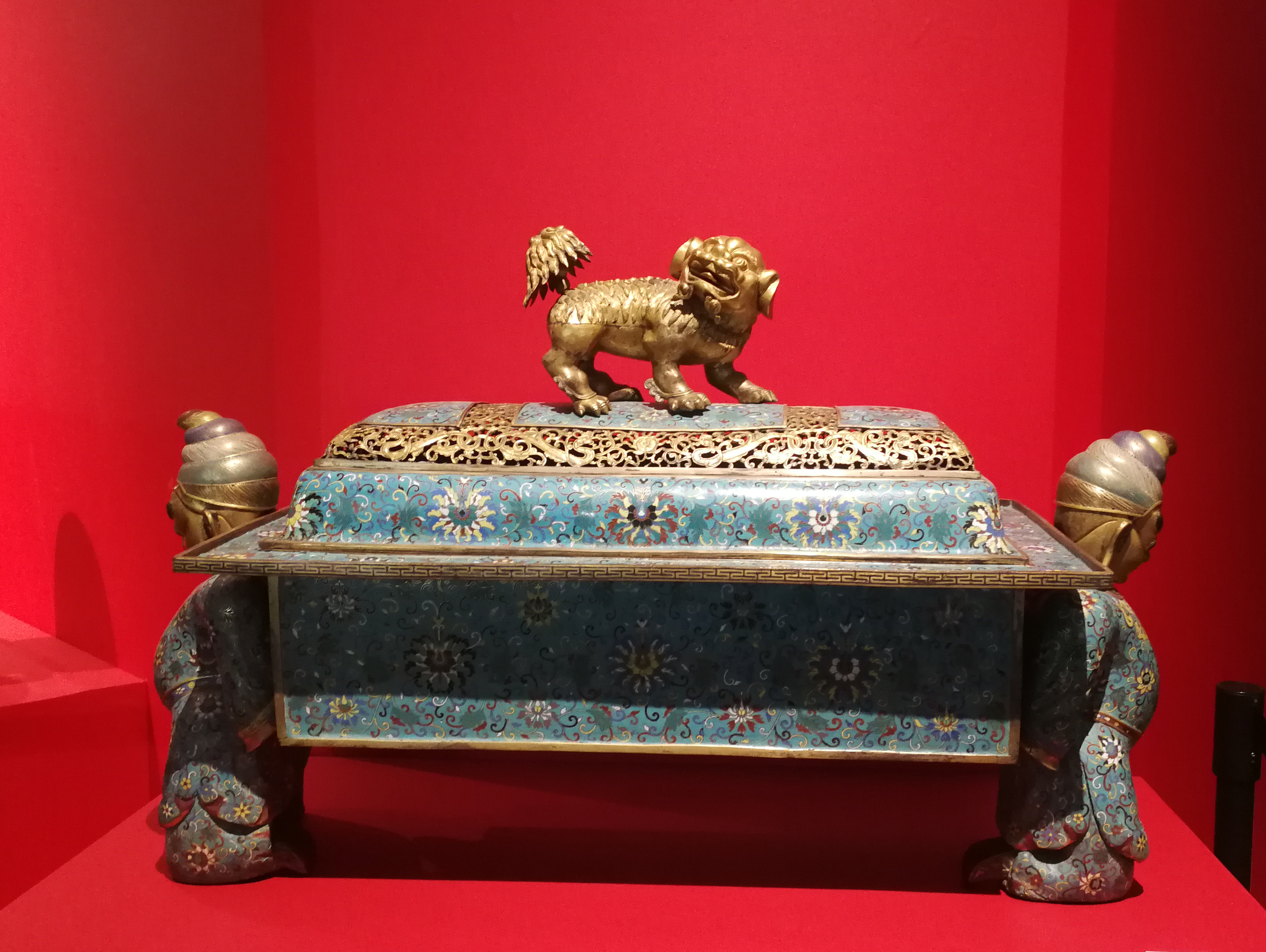 铜胎掐丝珐琅胡人献宝狮钮大熏炉