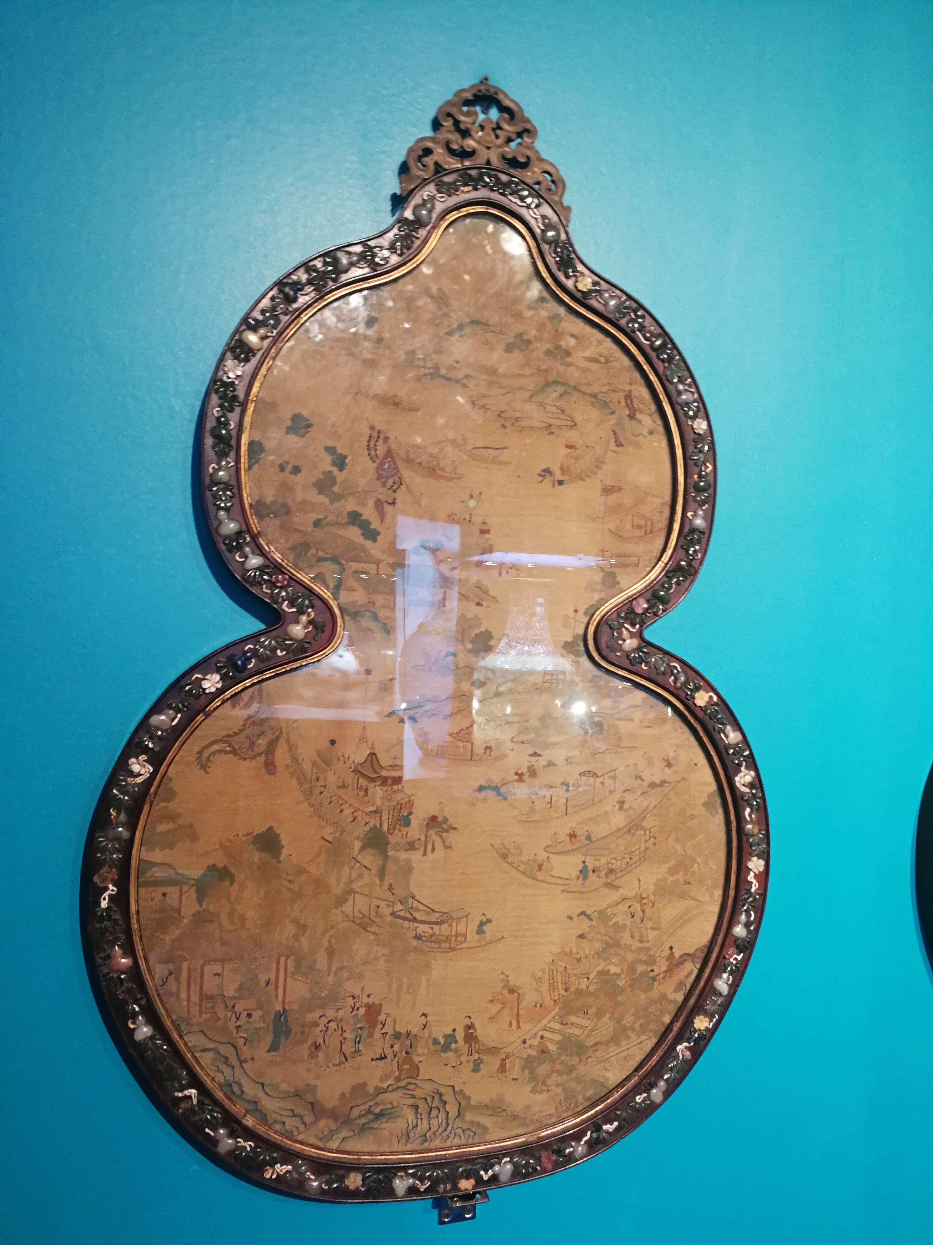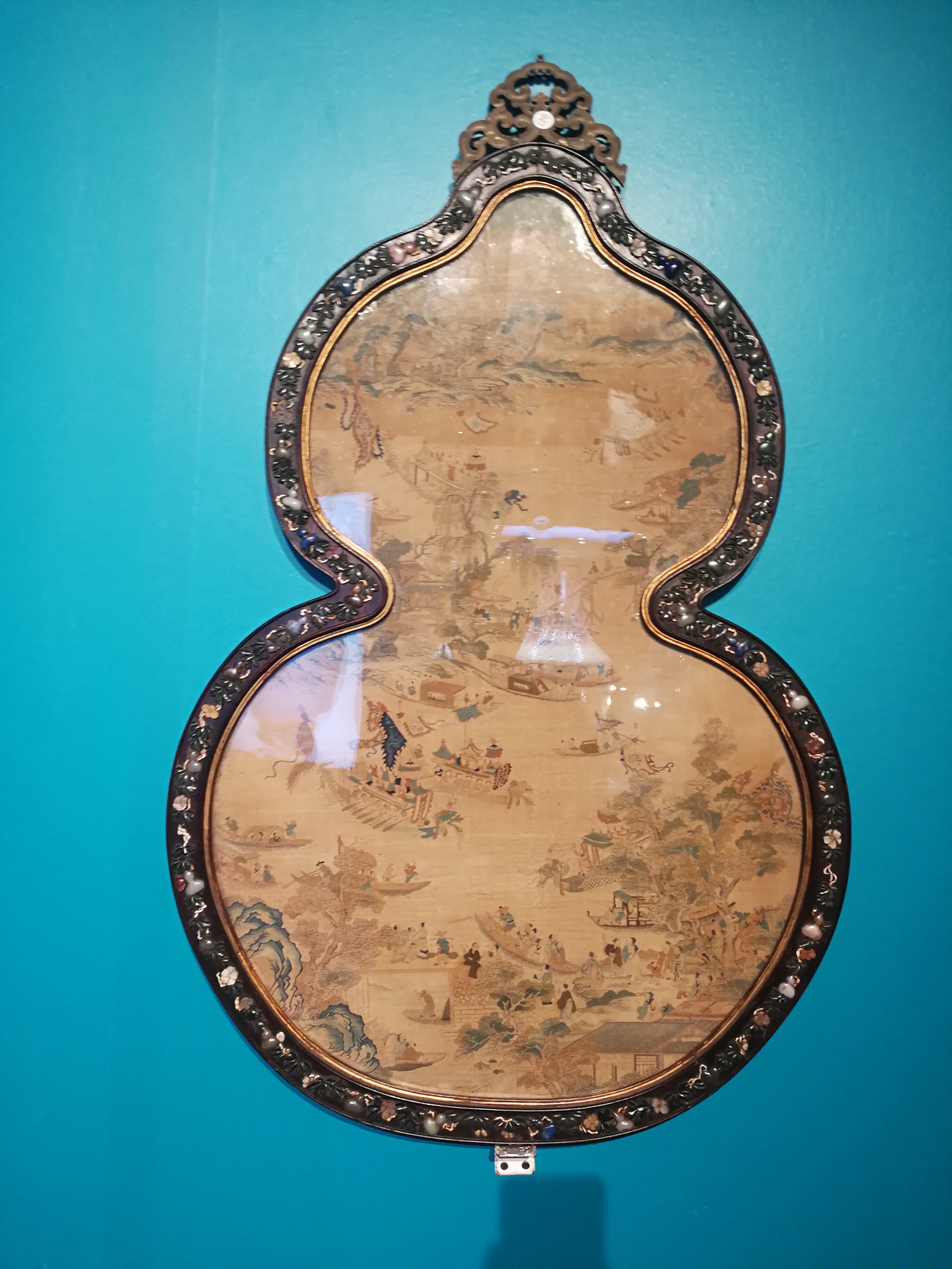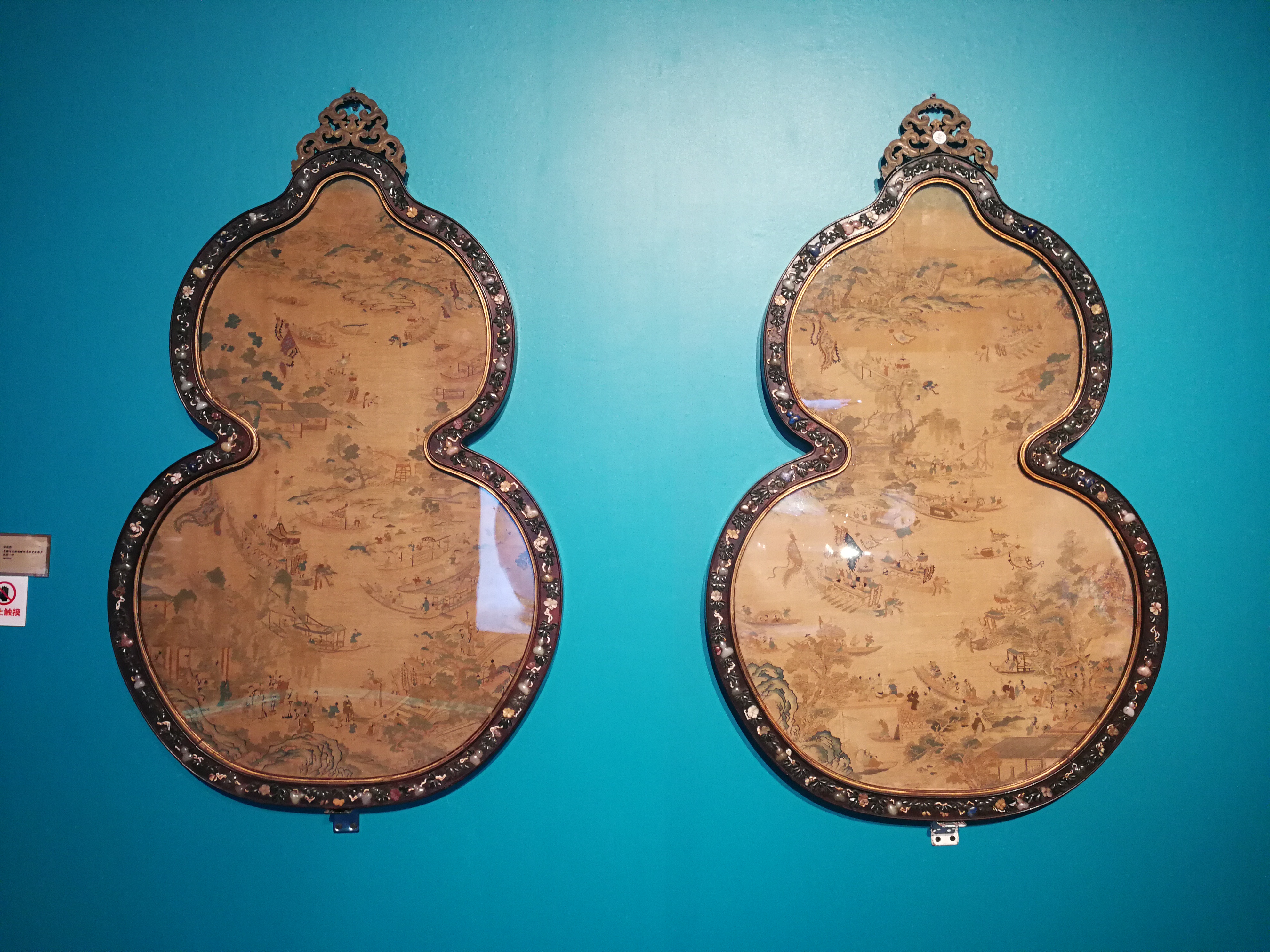 清宫之内殿宇众多,墙面装饰除了璧瓶之外,挂屏也是其中重要的品类之一,各种材质及装饰效果各异,异彩纷呈。此对葫芦挂屏的特殊之处在于其外框的形状与内心的制作上,首先依葫芦形状作框,边沿镶嵌葫芦形百宝及花叶,十分别致喜人,并且暗喻“福寿万代”之意,屏芯为缂丝山水人物,织造细腻,画面布局犹如一幅山水人物画,远山近水,其间楼台掩映,人物三五成群,杨柳之畔小桥横拨,水面上龙舟竞渡,热闹非凡,描绘了一派江南水乡的画面,其中无论人物还是景物,都以极细腻之线条表现出来,毫无经纬穿插之感,为不可多得的宫廷装饰珍品。