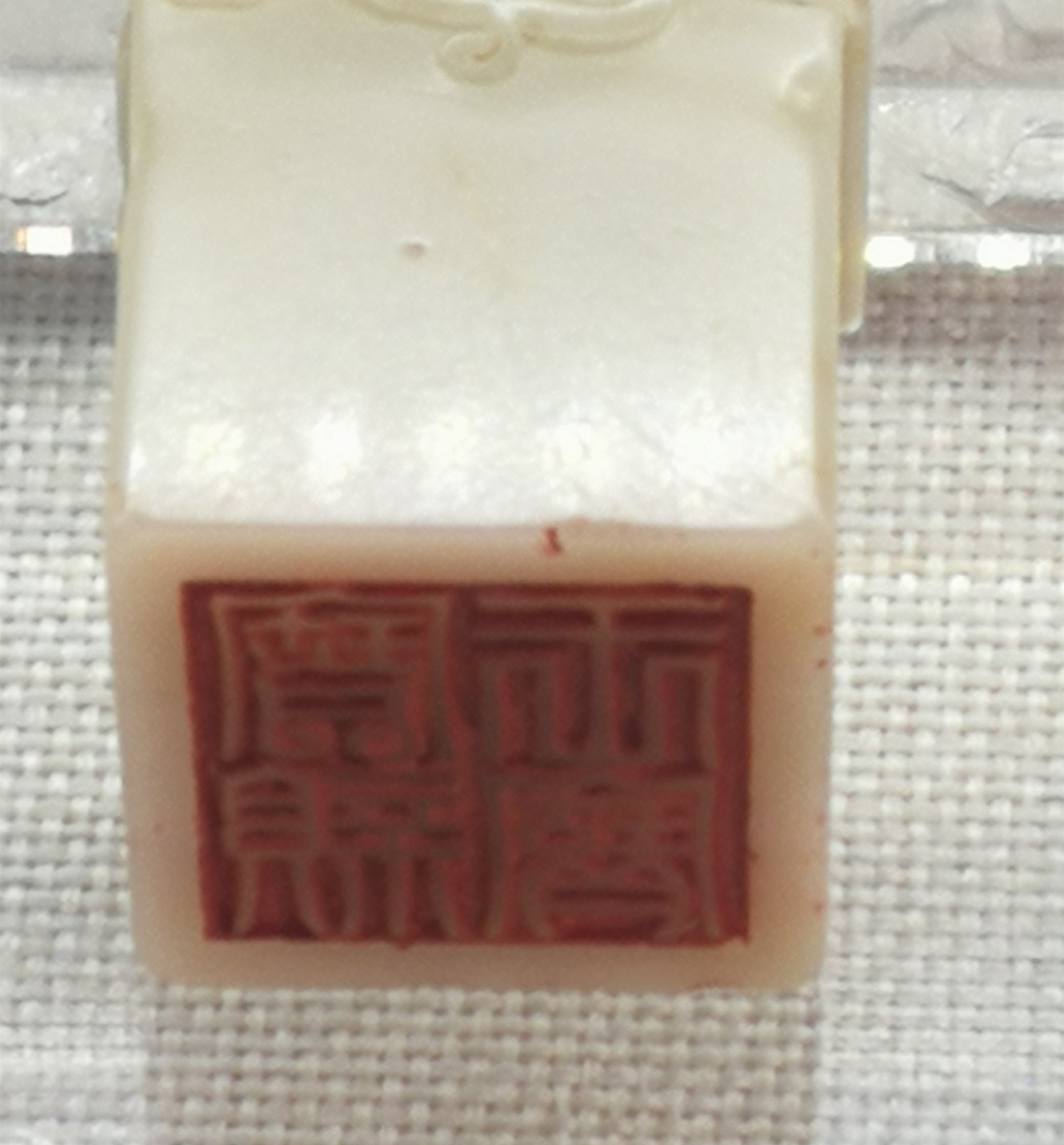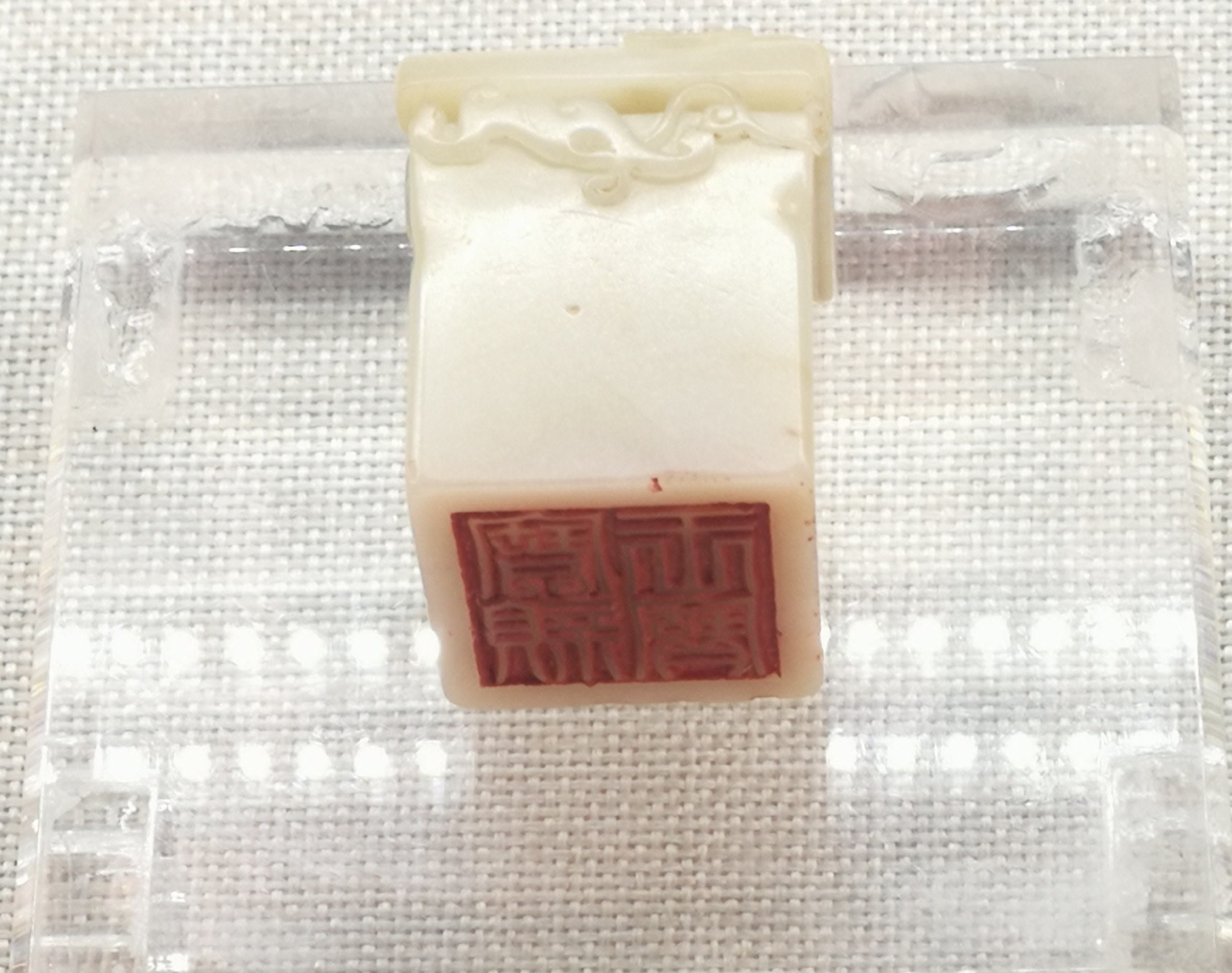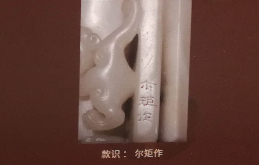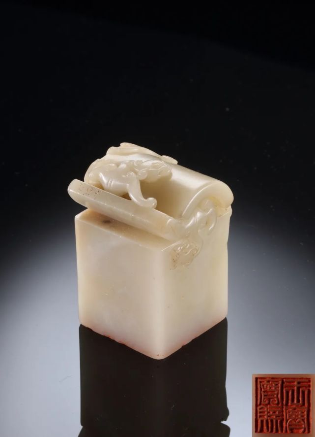 顶部作瓦钮样式雕双螭钮,螭身遒健,须发飘逸,为典型的清早期寿山石印纽雕刻风格。此玺刻有制钮者的名款,这在清代皇帝玺印中是非常少见的。按照惯例,服务于宫廷的御用工匠承做活计,很少有在作品上署名镌款的,而这方玺印却有“尔矩作”隶书款。“尔矩”是莆田人黄毂的字和号。虽然乾隆皇帝一生用印多达1800余方,但是其皇子时期的用印仅有 70 余印,反而更显珍贵。